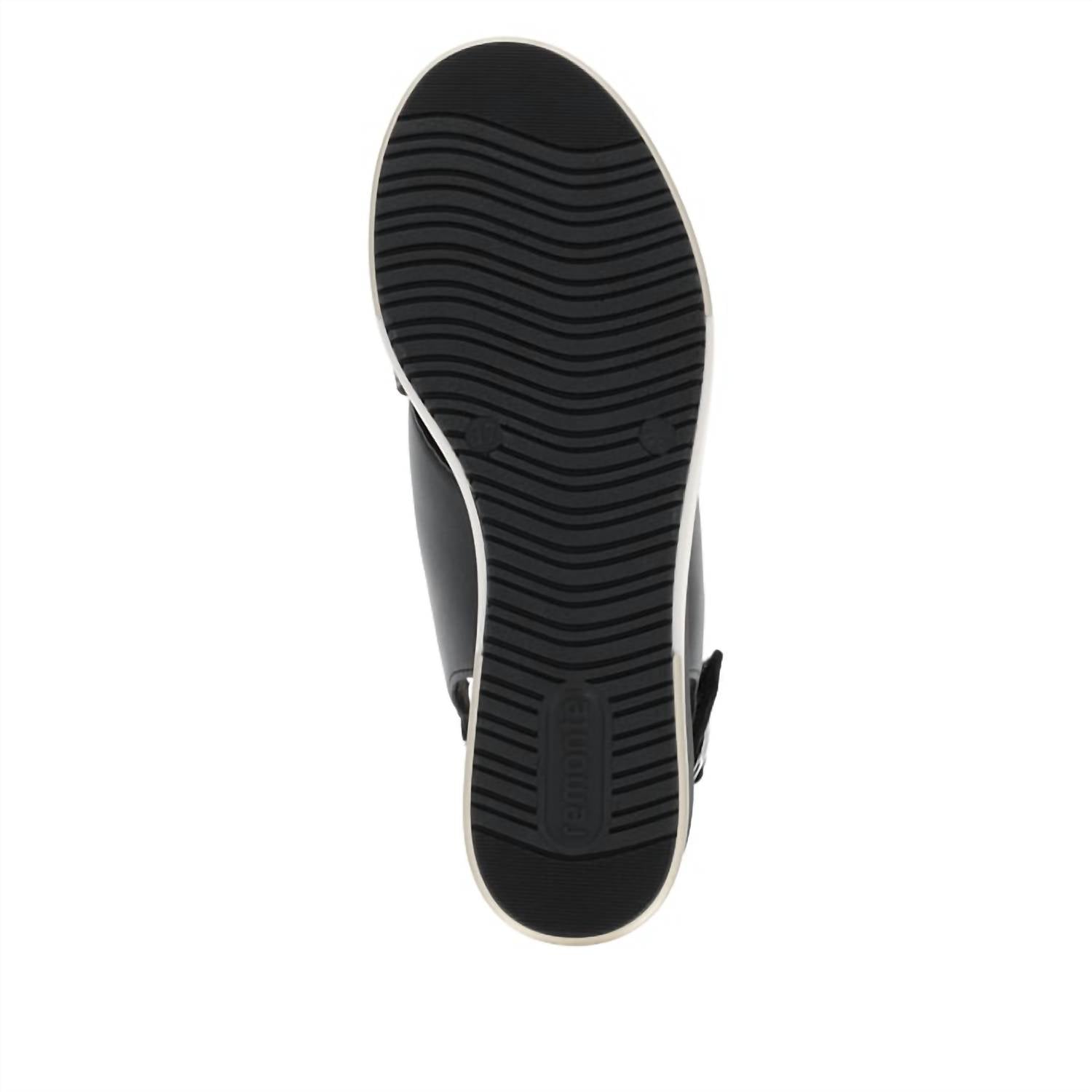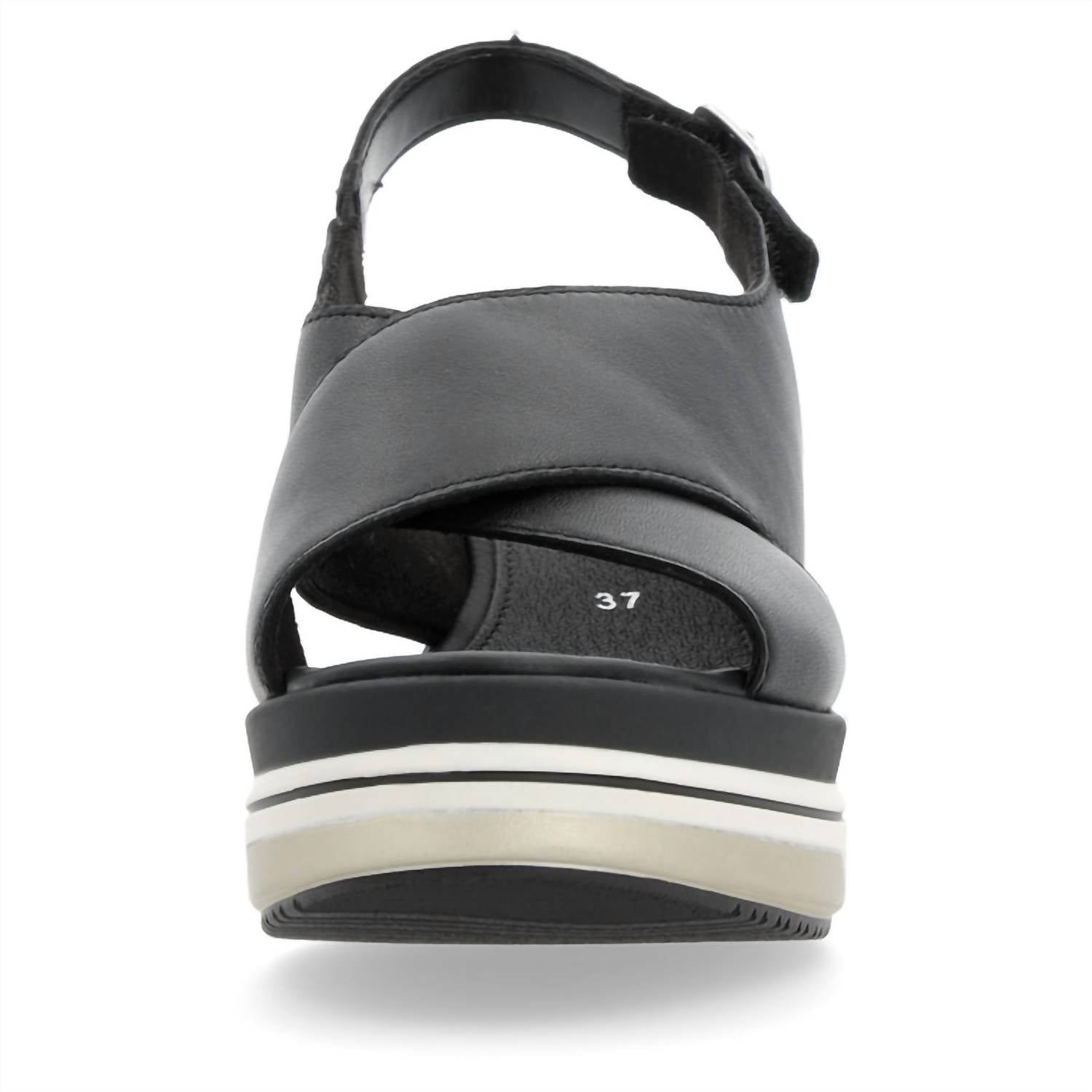 Step into style and comfort with the Women's Cross Strap Wedge Sandals by RIEKER, crafted in chic black leather. These sandals feature an open toe design with crossed leather straps and a hook and loop fastener for a snug fit, complemented by a narrow heel strap. The cushioned polyurethane sole with a 2.5" wedge heel offers stability and ease, while a breathable leather and micro-velour lining ensures dry and comfortable wear. Ideal for women seeking extended sizes, these sandals effortlessly blend function with fashionable flair.