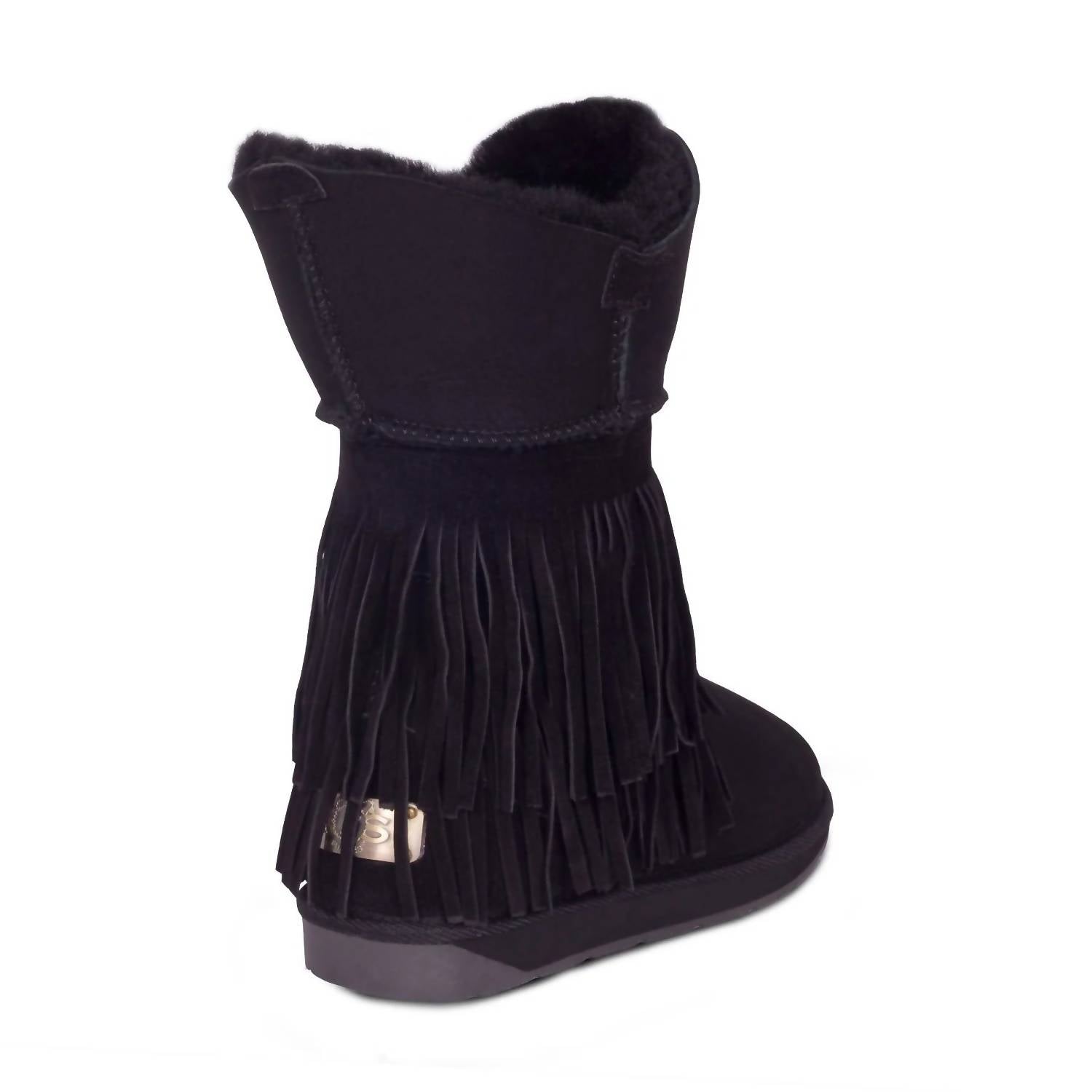 You'll be wishing for rainy days with these stylish yet functional rainboots. Step into elegance with RJ's Fuzzies Women's Classic Fringed Sheepskin Boot, a sophisticated choice for winter parties. These calf-high boots feature a double face sheepskin upper and a luxurious 100% genuine sheepskin lining, ensuring warmth and style. Designed in timeless black, they come with a durable EVA/TPR sole for dependable traction. The round toe shape complements its preppy trend aesthetic, making it an ideal addition to your winter wardrobe.