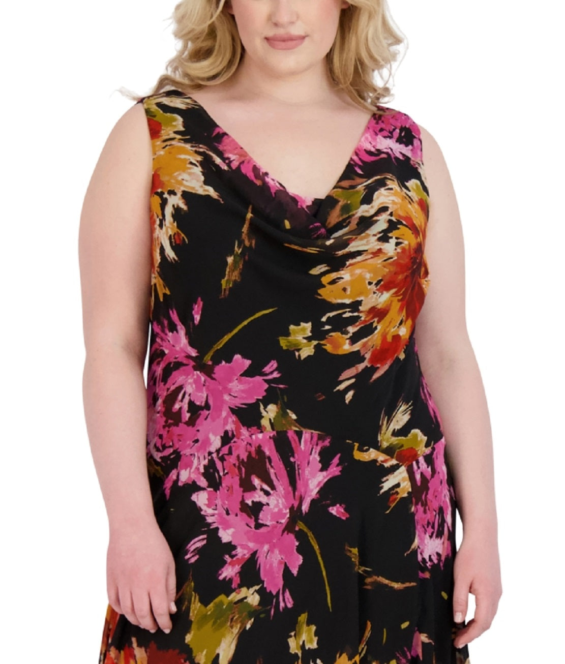 Um decote elegantemente drapeado abre este vestido em corte A lindamente estampado da Robbie Bee e uma bainha em formato de lenço o fecha com estilo.
