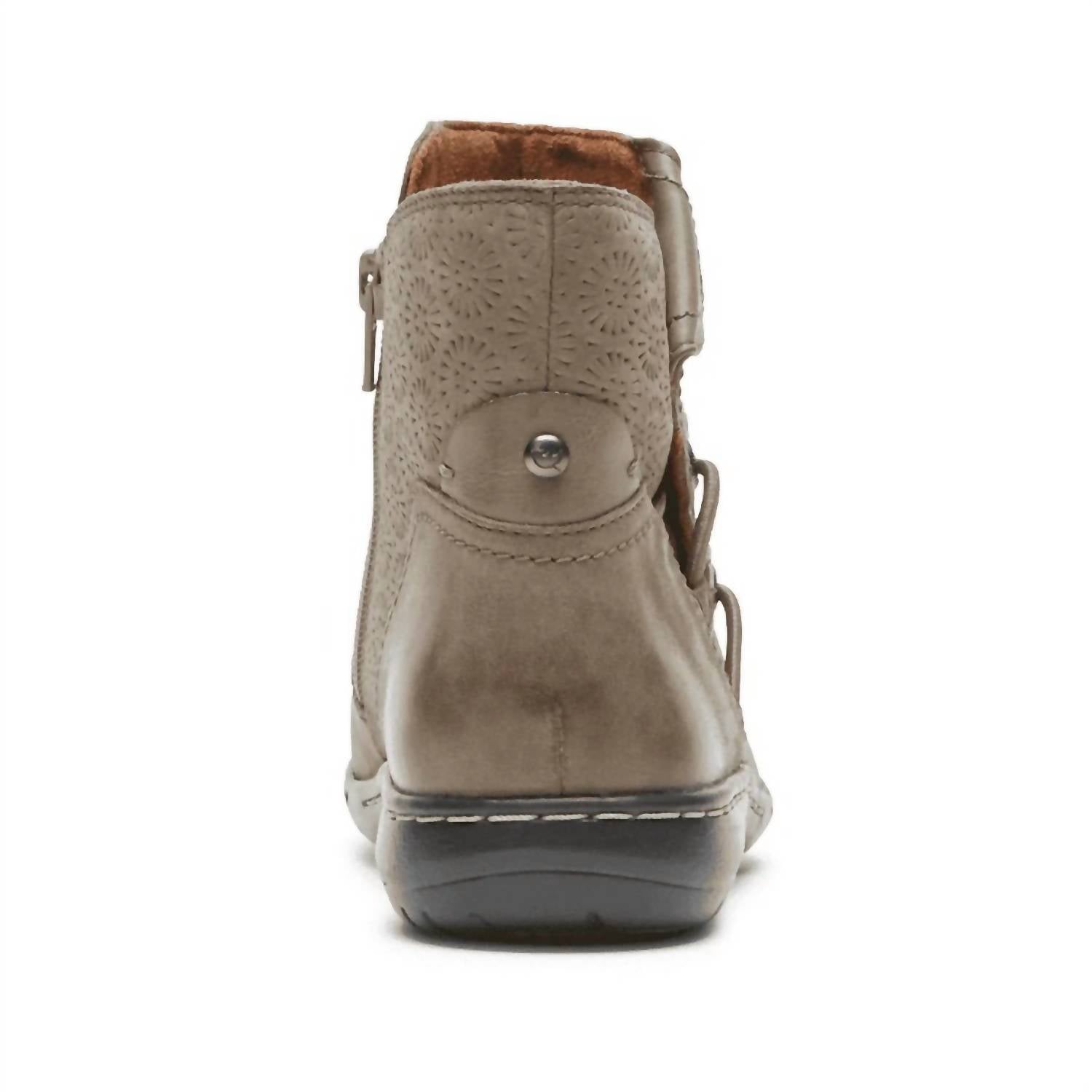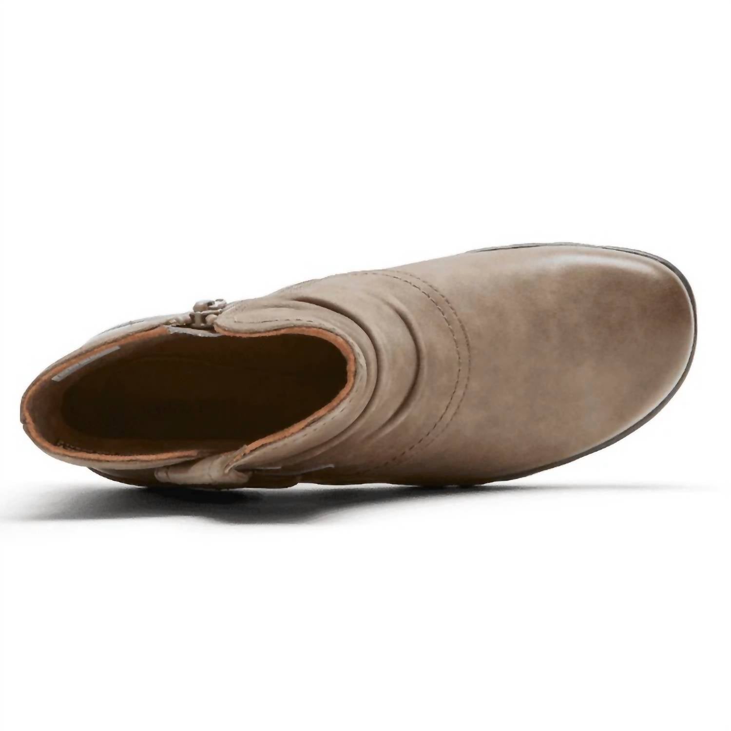 Meet the Women's Penfield Ruch Boot by ROCKPORT, a stylish addition to your spring wardrobe. This stone-colored ankle boot is perfect for dinner parties and offers a comfortable flat heel for all-day wear. Its Western-inspired design features a round toe that adds a versatile flair. Manufacturer ID: CI6908.
