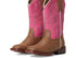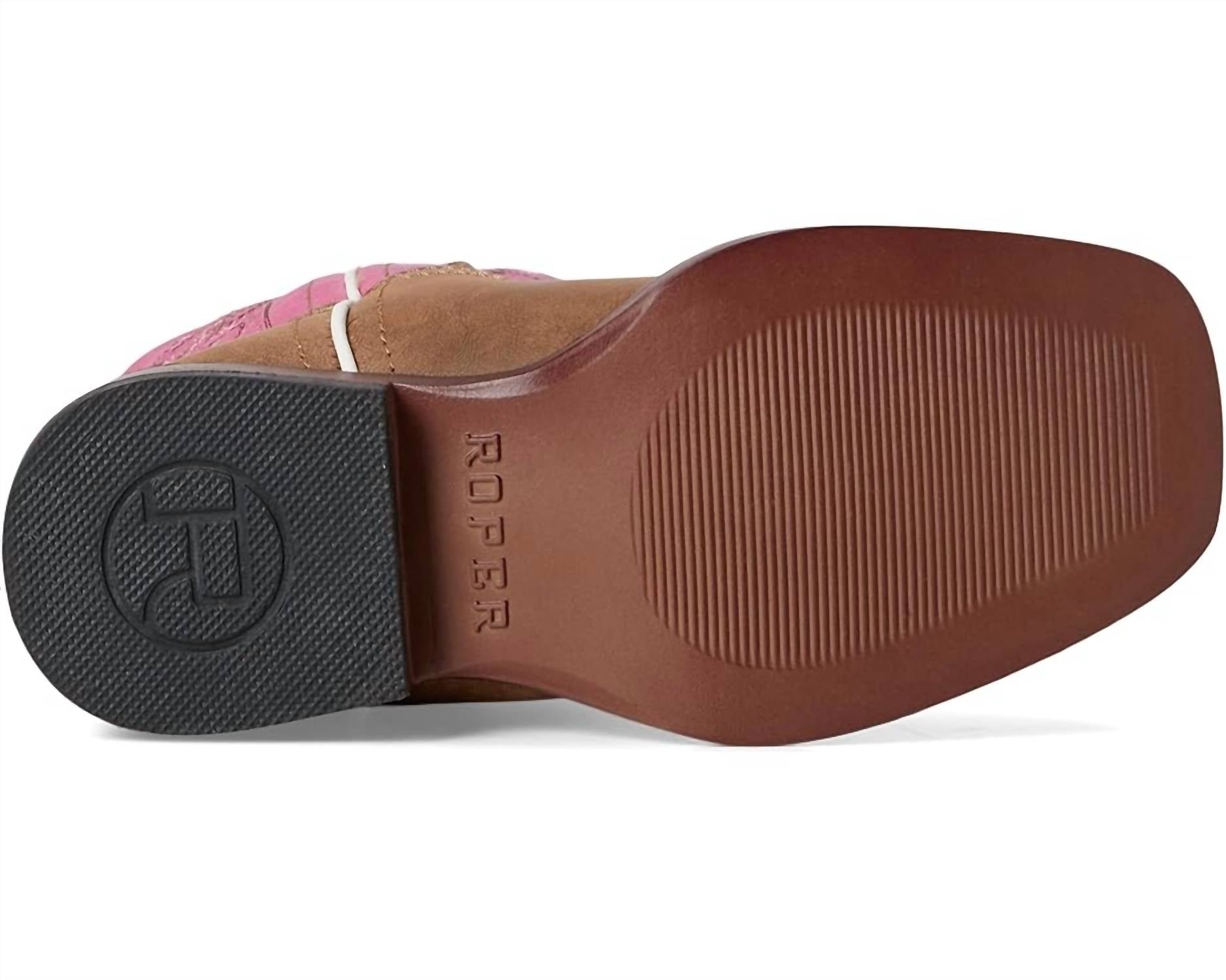 Introduce your little one to western flair with the Girl's Roper Ainsley Toddler Boot by ROPER. Crafted in tan faux leather, these boots feature vintage stitching and a unique overlay for added style. The mule ear pulls and an inside zipper ensure easy on and off, with a flexible bottom for comfort throughout the day. Perfect for a costume party or seasonal wear, these boots are designed with a squared toe and block heel for classic cowboy charm.