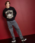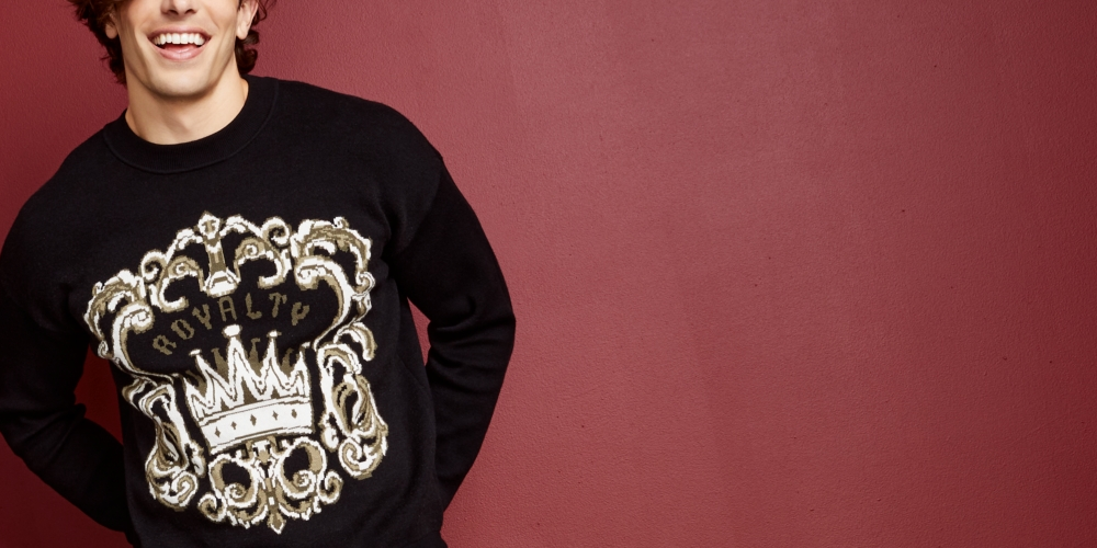 Complete seu visual para o clima frio com o logotipo da coroa majestosa estampado na frente deste elegante suéter jacquard estilo olho de pássaro da Royalty by Maluma | O astro mundial Maluma lança sua segunda coleção masculina e feminina de prêt-à-porter Royalty by Maluma exclusivamente na | Para Maluma | esta coleção representa uma maneira de ele dar vida a um pedaço de suas raízes colombianas e da cultura latina e compartilhá-la com o mundo | (Liquidação)