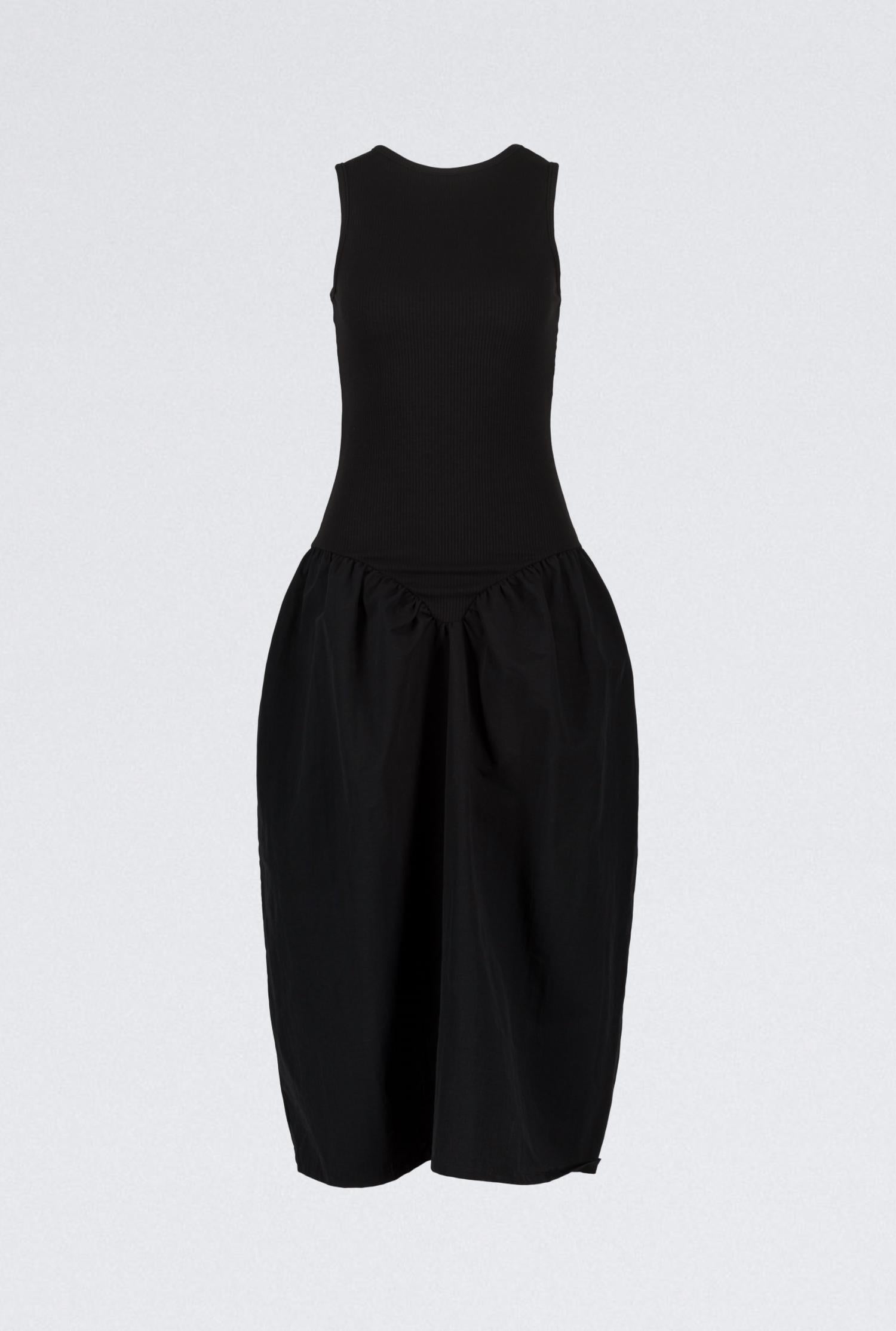 Discover the Sporty Peplum Dress by SAEMDI, a chic and sophisticated choice for your next holiday party. This sleeveless dress features a flattering A-line silhouette that extends to a mid-calf length, with Saemdi embroidery accentuating the crewneck. Composition: Top is made of 80% polyester, 11% spandex, 9% rayon, while the skirt is 100% nylon. Effortless and minimalist in black, it includes convenient pockets and is sure to become a staple in your spring wardrobe. Model is 173 cm tall and is wearing a size XS.