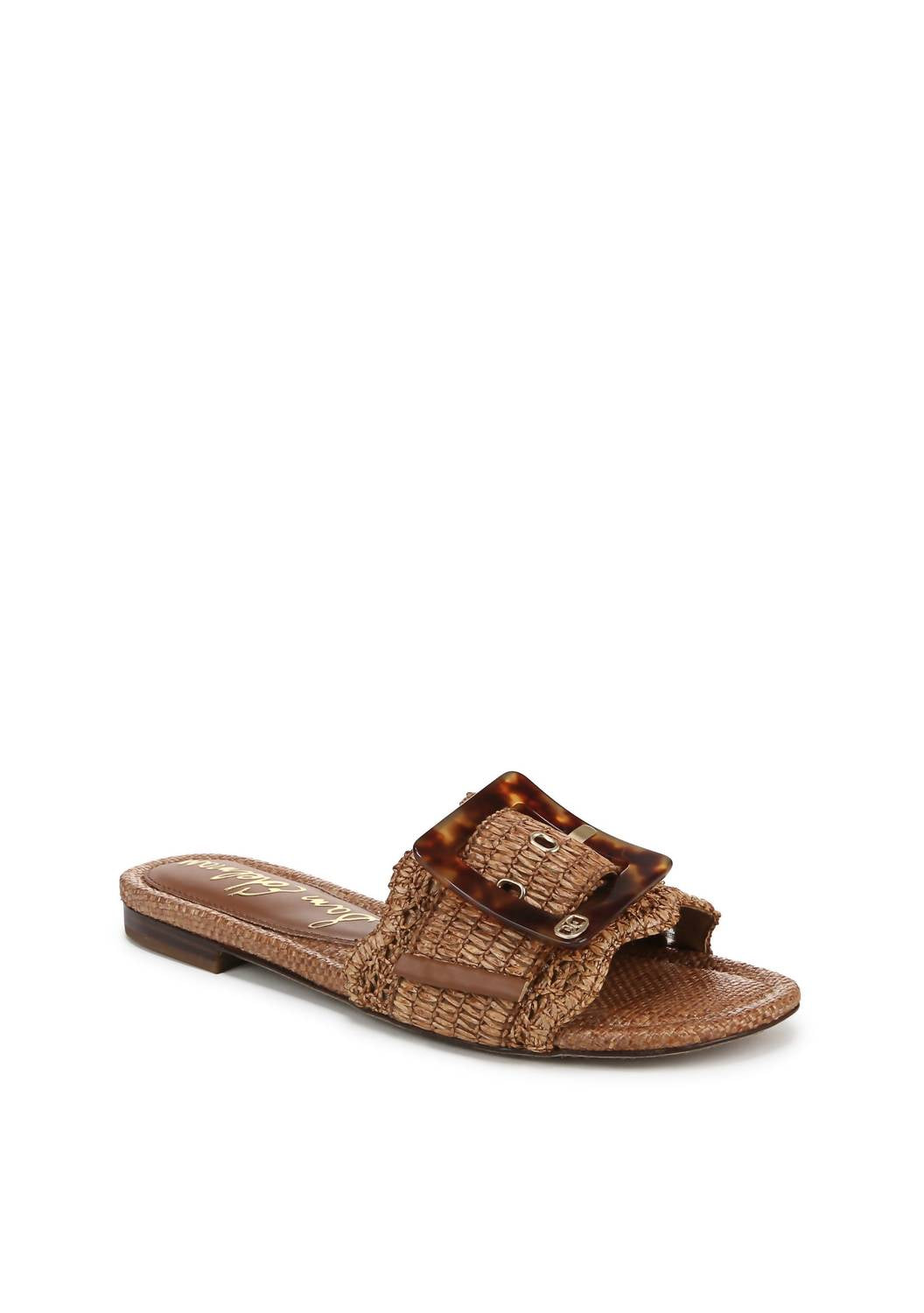 Vestidos esvoaçantes, calças cropped e até macacões... esta sandália combina com todos eles! Entre no estilo com a sandália Bambi Slide da Sam Edelman, um complemento perfeito para o seu guarda-roupa de verão. Estas sandálias chiques apresentam um cabedal de ráfia adornado com uma fivela de resina oversized, adicionando um toque divertido a qualquer look. Desenhadas com bico aberto e salto plano confortável de 1,2 cm, são perfeitas para viagens e ocasiões de verão. O fecho é slip-on e a palmilha é feita de material sintético para maior praticidade e praticidade.