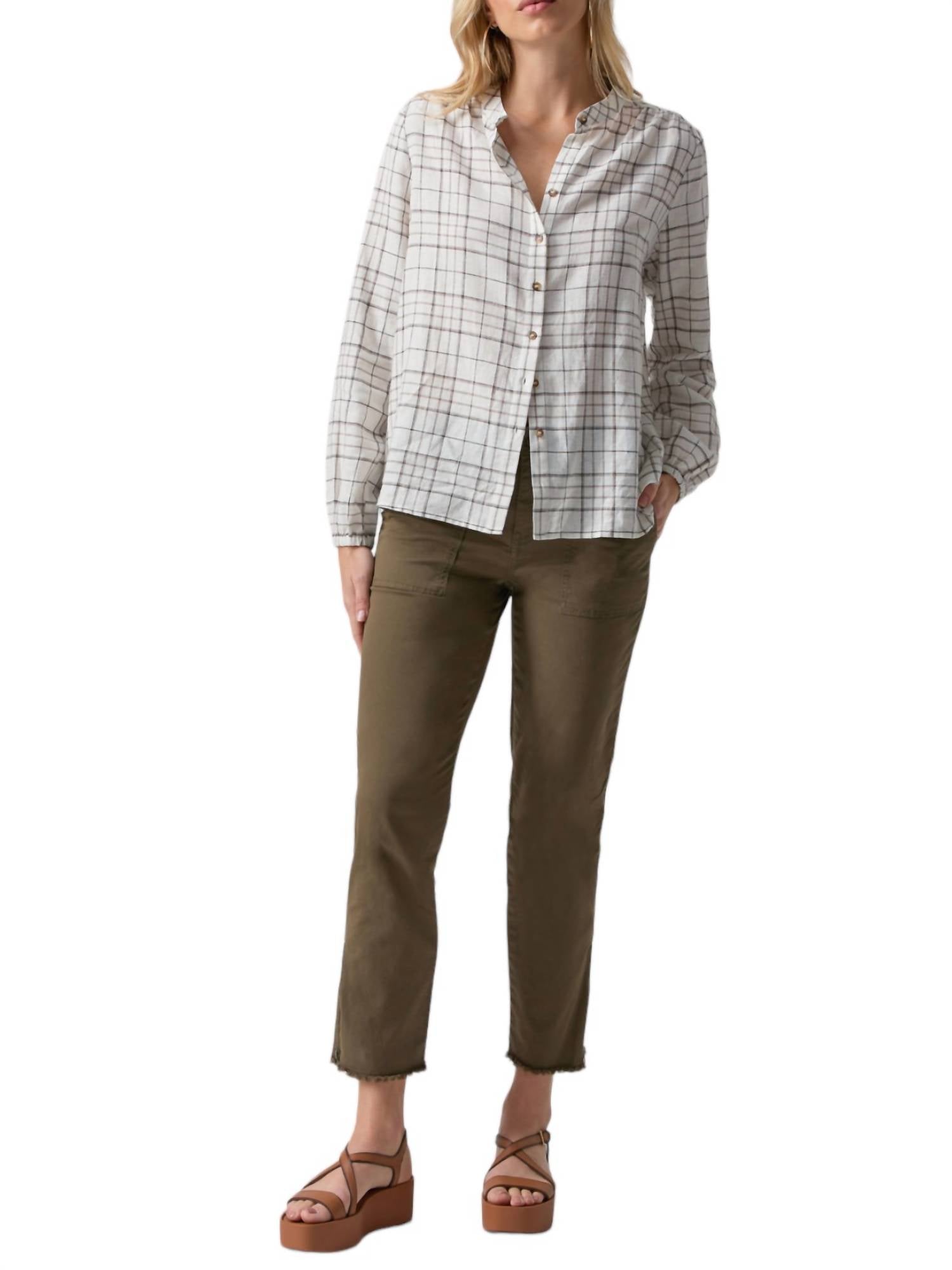 This lightweight linen blend button-down blouse features a relaxed fit and elastic cuff detail. It has a standard collar and button front. Fabric: 52% linen, 48% cotton. The model is 5'9" wearing size S. Machine wash cold, tumble dry low.