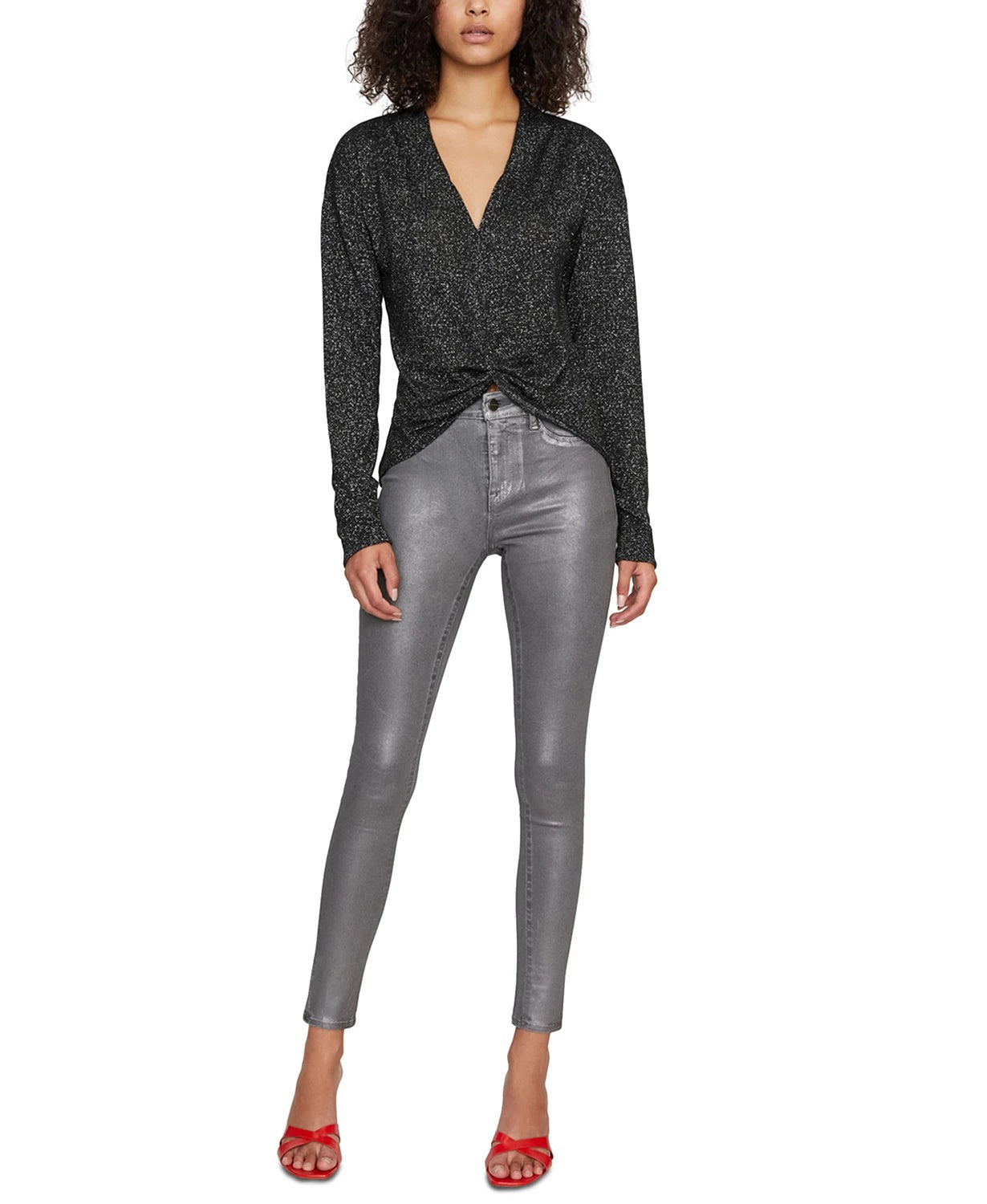 Aproximadamente 60 cm de comprimento nas costas | Decote em V profundo | Frente drapeada com detalhe de nó na bainha frontal central | Rayon/poliéster/nylon/metálico | Lavável à máquina | Importado