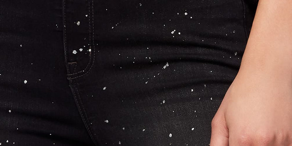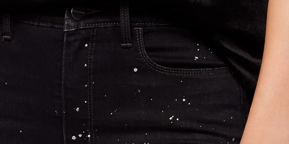 Fecho de zíper e botão na frente | Passadores de cinto | Respingos de tinta metálica por toda parte | Viscose