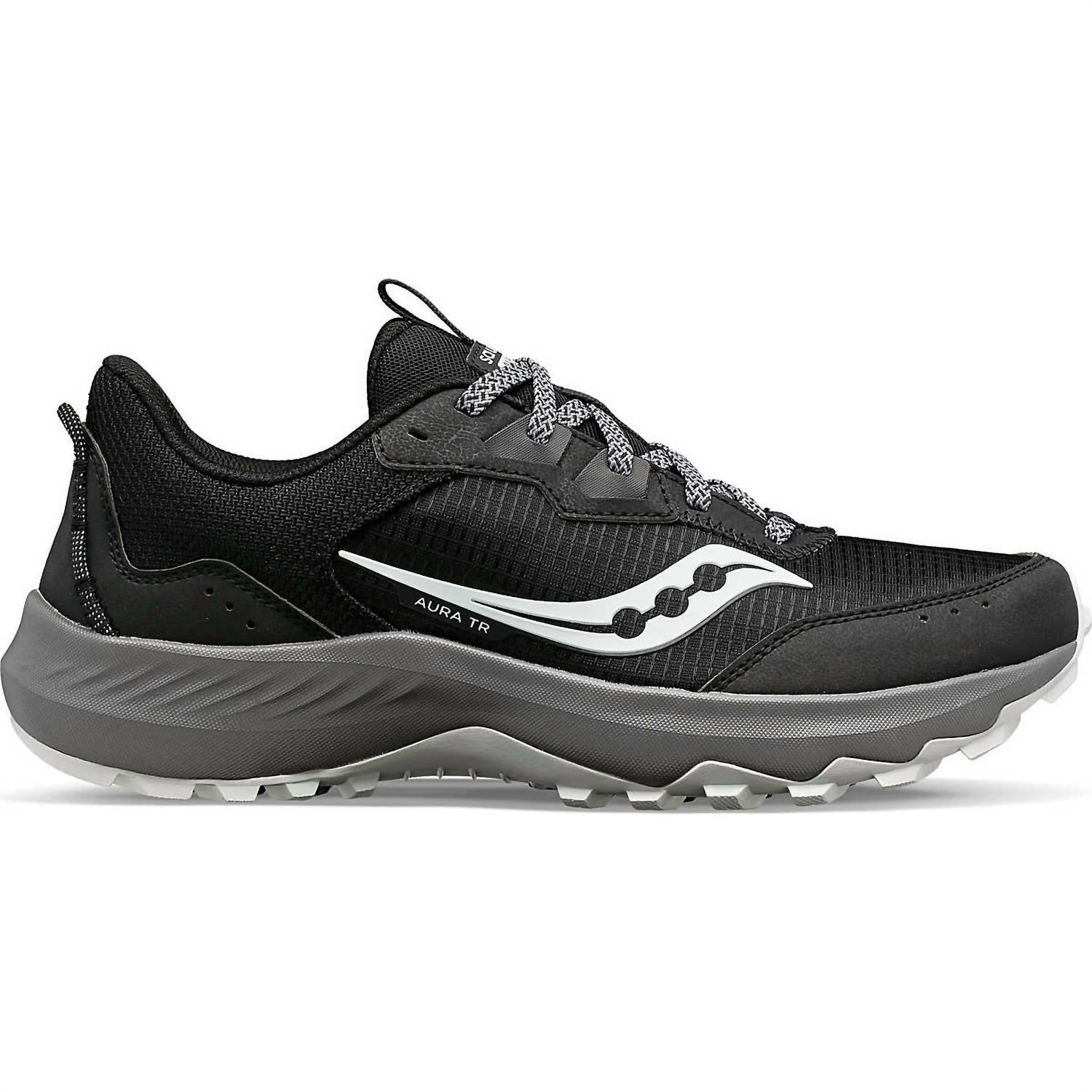 Introducing the SAUCONY Men's Aura TR Running Sneakers in Black/Gravel, designed for trail and neutral runners looking for a reliable fitness companion. These sneakers feature a sleek, streamlined upper with a durable and breathable two-layer mesh and protective details where you need them most. The VERSARUN cushioning and grippy XT-600 lugs provide comfort and superior traction across any terrain. With a heel-to-toe offset of 0.31 inches (1.22 inches heel/0.91 inches forefoot) and weighing in at 9.6oz (272g), these round-toe, flat-heeled sneakers are perfect for your summer athleisure adventures. Ideal for fitness/workout occasions.