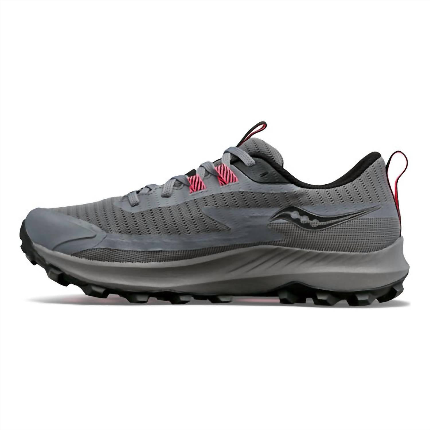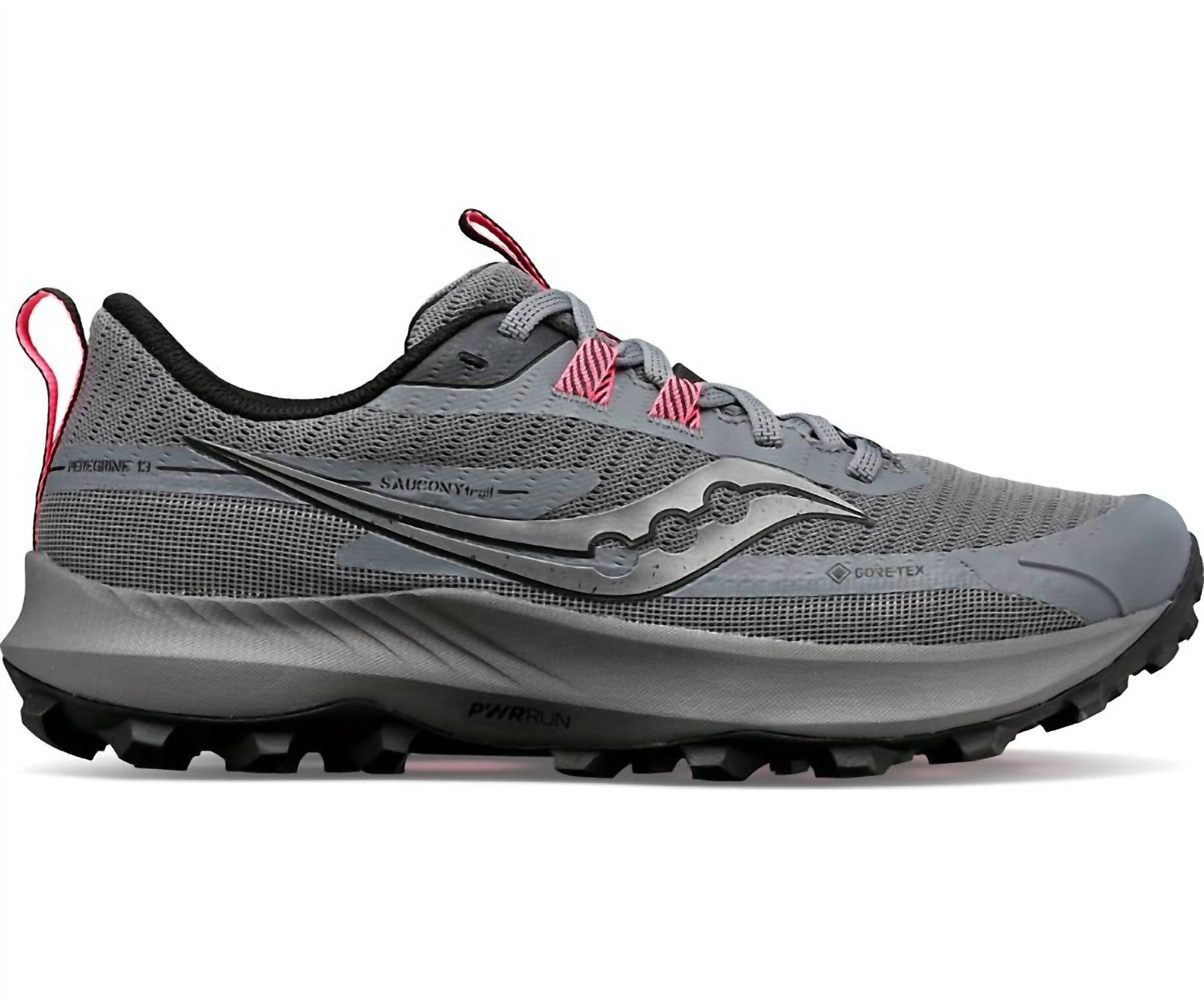 Experimente um desempenho incomparável com o Tênis de Trail Running Feminino Peregrine 13 GTX da Saucony, projetado para quem busca aventura. Este tênis versátil conta com um ajuste invisível GORE-TEX® à prova d'água para proteção flexível e um solado de borracha PWRTRAC com proteção contra pedras para tração superior. Confeccionado com entressola de espuma PWRRUN para amortecimento leve, ele é feito sob medida para o explorador off-road de verão. Com um offset de 4 mm do calcanhar à ponta e pesando apenas 238 g, este tênis vegano na cor Gravel/Preto combina estilo com sustentabilidade para quem é ativo.