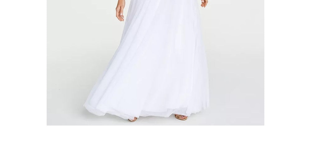 Aproximadamente 152 cm de comprimento, do centro do pescoço até a bainha. O comprimento varia 0,6 cm entre os tamanhos | Decote em V em formato de coração | Fecho de zíper lateral | Alças ajustáveis | Corpete bordado com strass; costas com amarração; saia de malha