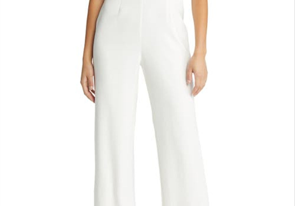 Cor branca para casamento | Tamanho pequeno | Detalhe de penas artificiais | Material de cetim | Design sem mangas | Estilo macacão | Zíper delicado nas costas | Cintura elegantemente marcada | Macio | Caimento fluido | Decote em V elegante | Marca Saylor aclamada | Exclusivo da Nordstrom.