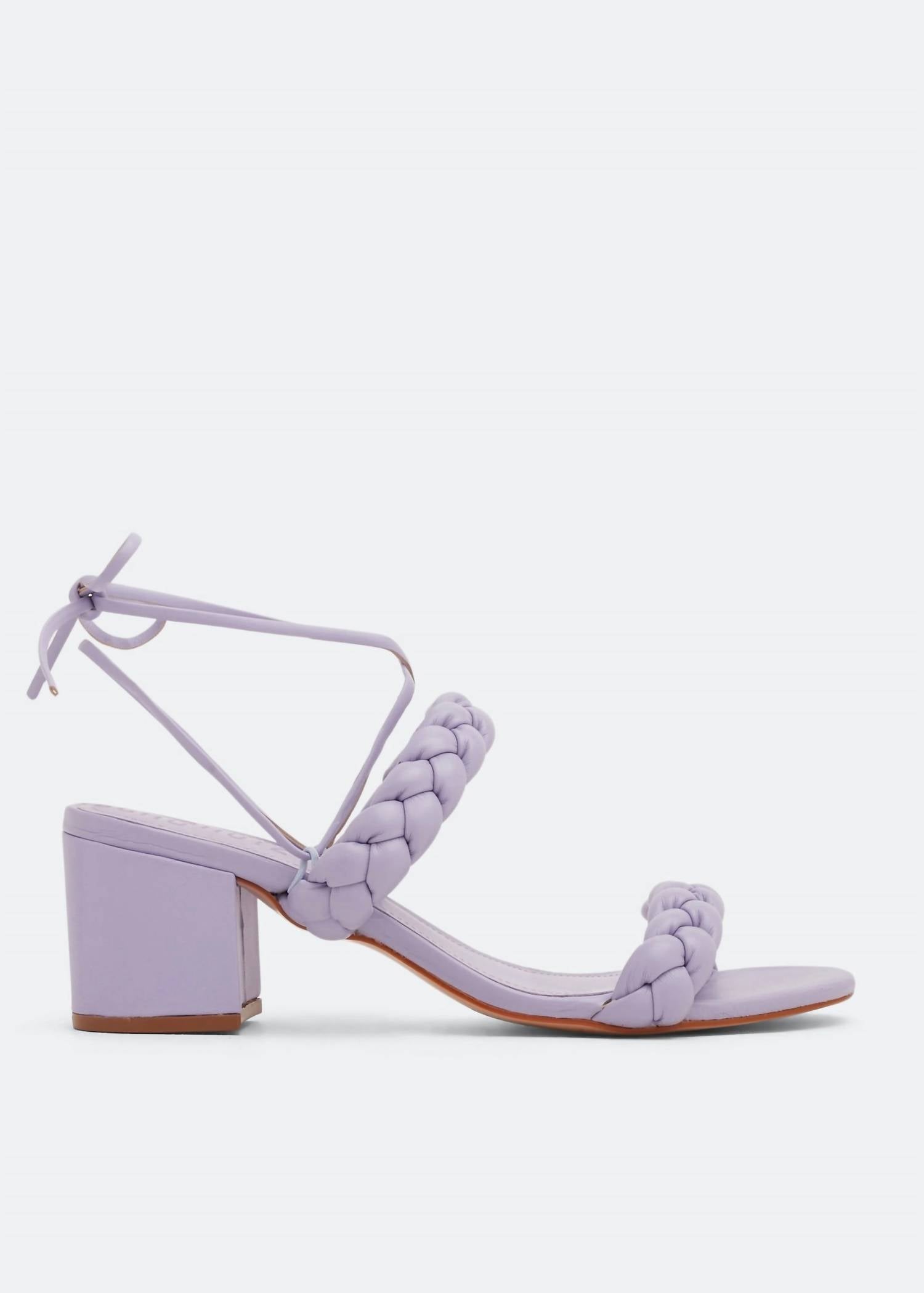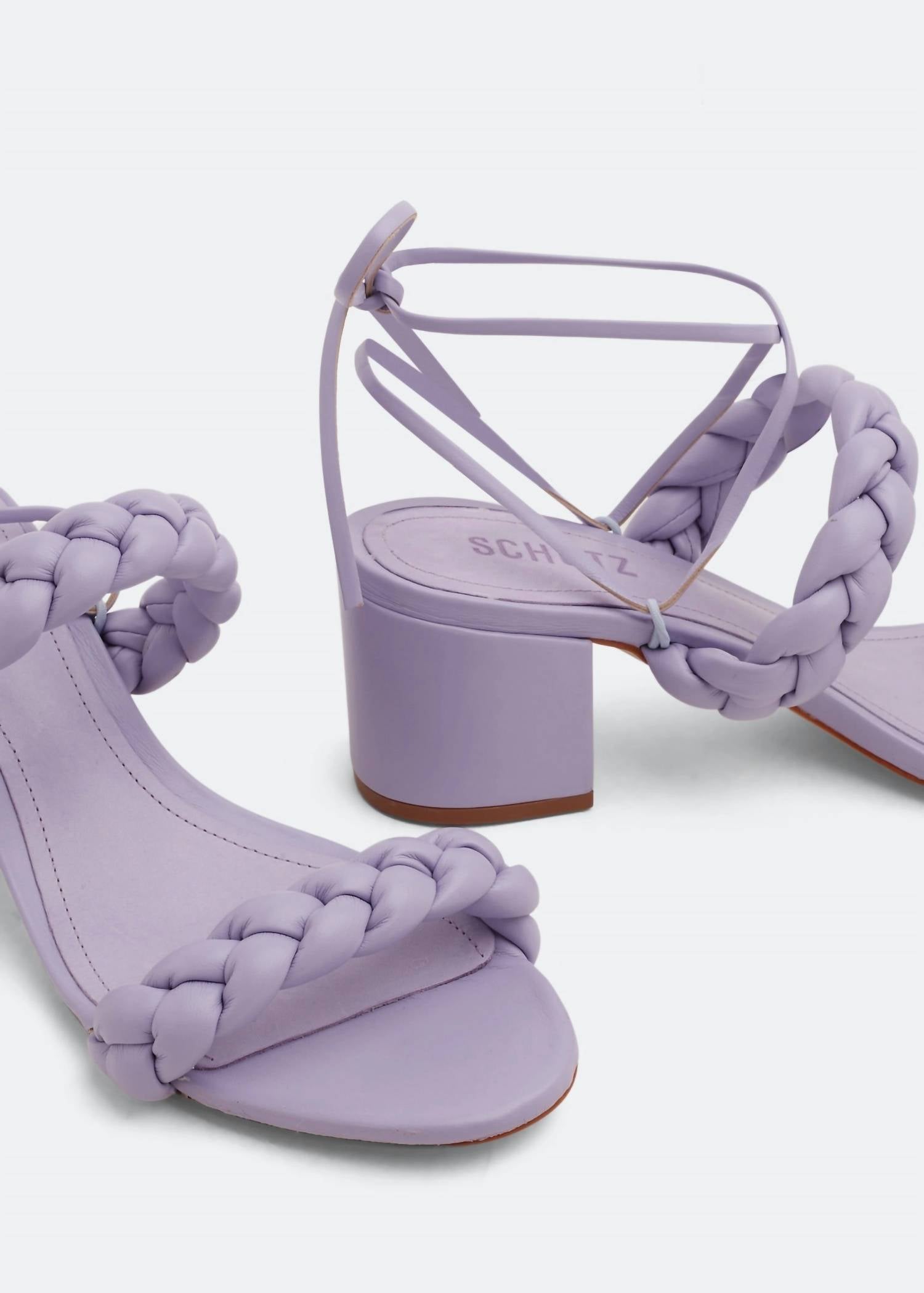 This sandal will take you from brunch to dinner and everything in between. Step into elegance with the Women's Zarda Sandal by SCHUTZ, finished in a captivating Smoke Grape color. This statement sandal features a double strap design with braided details and an adaptable ankle strap for a versatile day-to-night transformation. The high block heel stands at 4.1 inches (105mm), offering both height and comfort with its round toe and open counter style. Made from faux leather with a cow leather outsole and lining, it embodies minimalist trends for cocktail parties or special occasions like Thanksgiving.