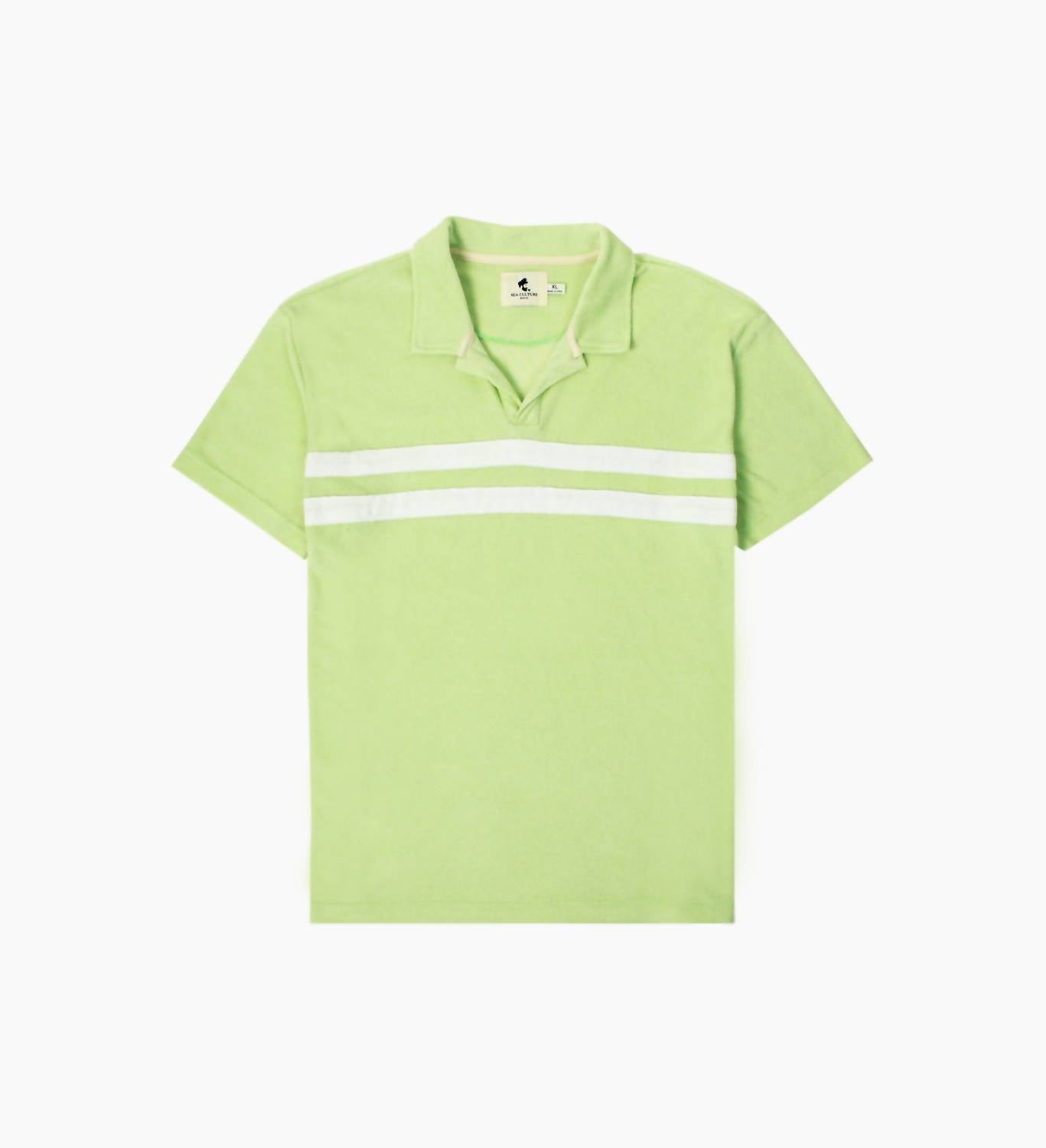 Introducing the Resort Terry Polo by Sea Culture, a stylish choice in vibrant Key Lime, perfect for any occasion. This men's polo features short sleeves and a comfortable pull-on closure, crafted from a soft cotton blend composed of 80% cotton and 20% polyester. Highlighting a classic collar and French terry stripes across the chest, it brings a touch of vintage sportswear flair to your summer wardrobe. Made with a relaxed fit and slightly cropped arms, this piece provides easy, effortless style. Care instructions: Machine wash and tumble dry. Imported.