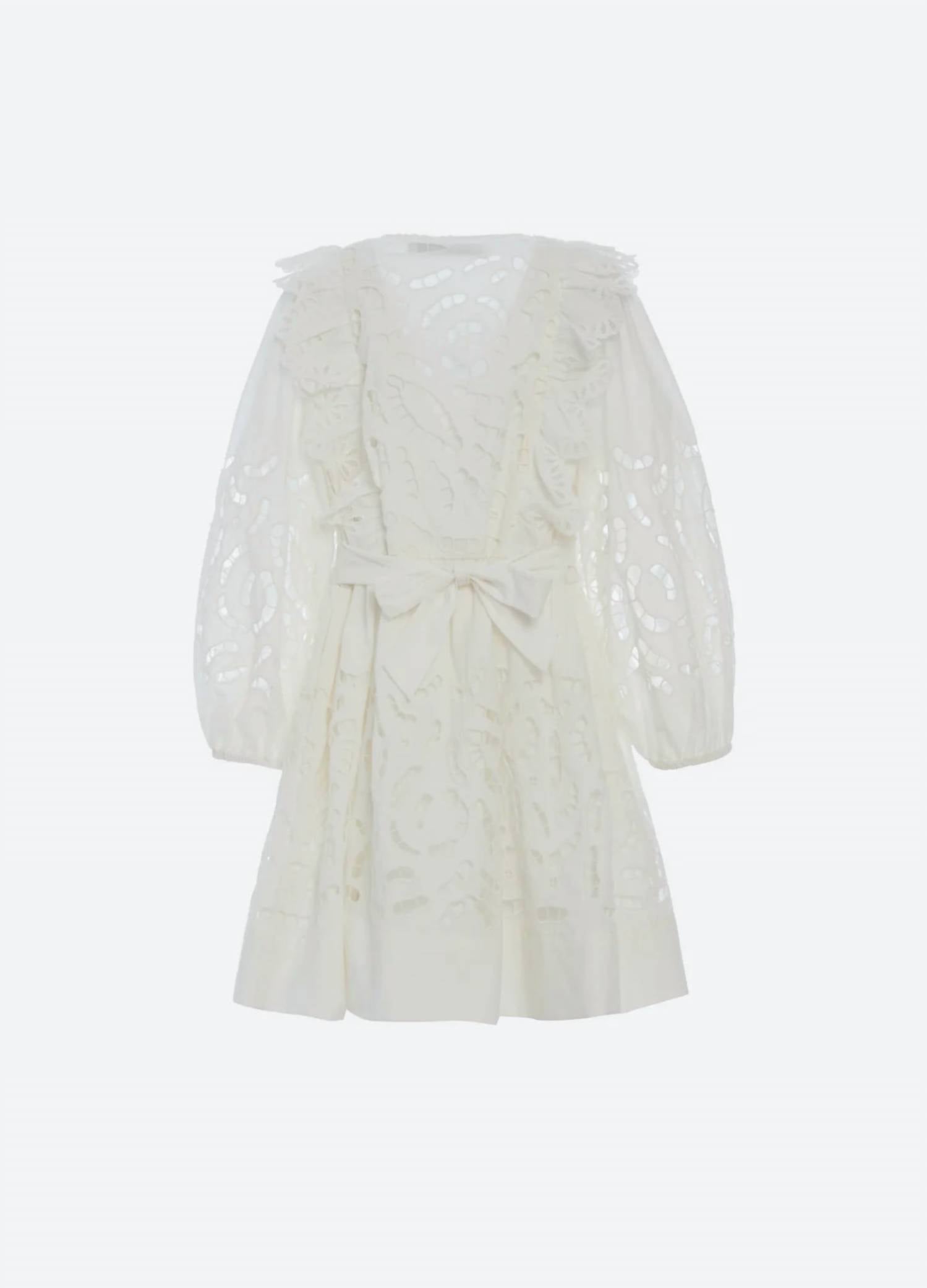Delightful choice for Thanksgiving or any holiday party. Featuring long puff sleeves and ruffle detailing at the bodice. Crafted with a composition of 100% cotton for both the self and lining, includes embroidery made from 100% polyester. Closure is with a button front. Care instructions specify hand washing. Perfect for fall, this white, patterned dress is designed for girls with a minimalist touch.