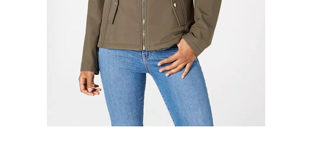 Aproximadamente 66 cm de comprimento do centro das costas até a bainha | Decote redondo com cordão e capuz; fecho de zíper frontal | Resistente à água | Dois bolsos de pressão na frente; bolso com zíper no peito | Poliéster | Lavável à máquina