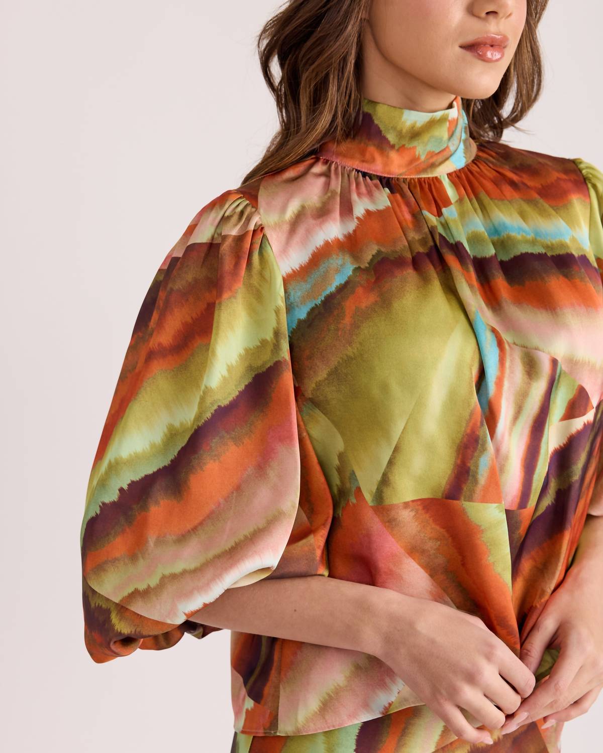 A versatile blouse that works from desk to dinner! Elevate your wardrobe with the Carmen Top by S'edge, featuring stylish three-quarter puff sleeves and a chic ruched turtleneck collar. This blouse showcases a striking agate graphic pattern, embodying this season's maximalist trend. Made from 100% polyester and expertly crafted in China, it secures with a two-button closure at the back. Care is simple with dry clean instructions and line dry advice for maintaining its pristine look.