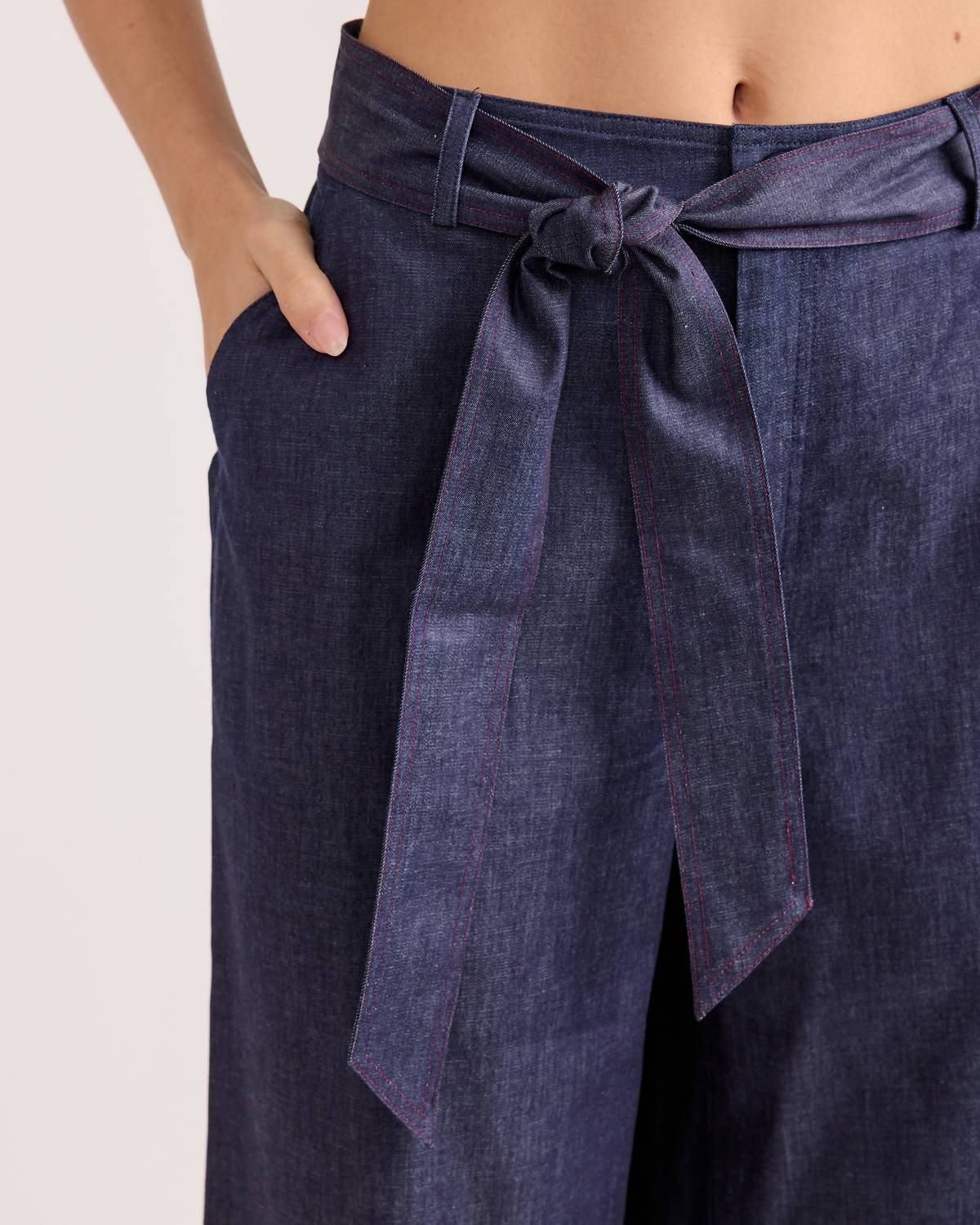 Discover the effortlessly stylish Harrison Pant by S'edge, a relaxed fit, high-rise wide-leg silhouette in a deep indigo wash. Crafted from a cotton blend material, these pants feature practical side and back pockets and a flattering self-tie belt with red stitching. Made in China, they come with a zip fly and button closure and an elastic back waistband for added comfort. Care for these minimalist, dark wash pants by dry cleaning only. Model is wearing a size S. Ideal for both casual days and elevated evenings.