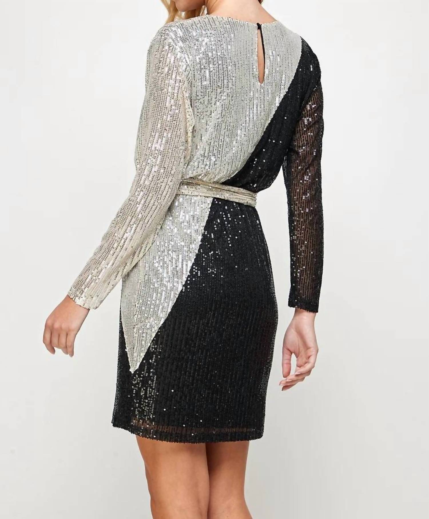O Vestido de Manga Longa com Blocos de Cores e Lantejoulas da SEE AND BE SEEN é um item essencial para sua coleção em ocasiões especiais. Confeccionado com um design assimétrico, este deslumbrante minivestido preto e prata apresenta uma faixa de lantejoulas e mangas compridas confortáveis. O comprimento da peça é de 91 cm, oferecendo um corte justo e elegante com fecho nas costas em formato de fechadura para um charme extra. Perfeito para as festas de fim de ano, esta peça se destaca com seus detalhes texturizados e estampa vibrante de blocos de cores. A modelo tem 1,78 m de altura e veste tamanho P com busto de 46 cm.