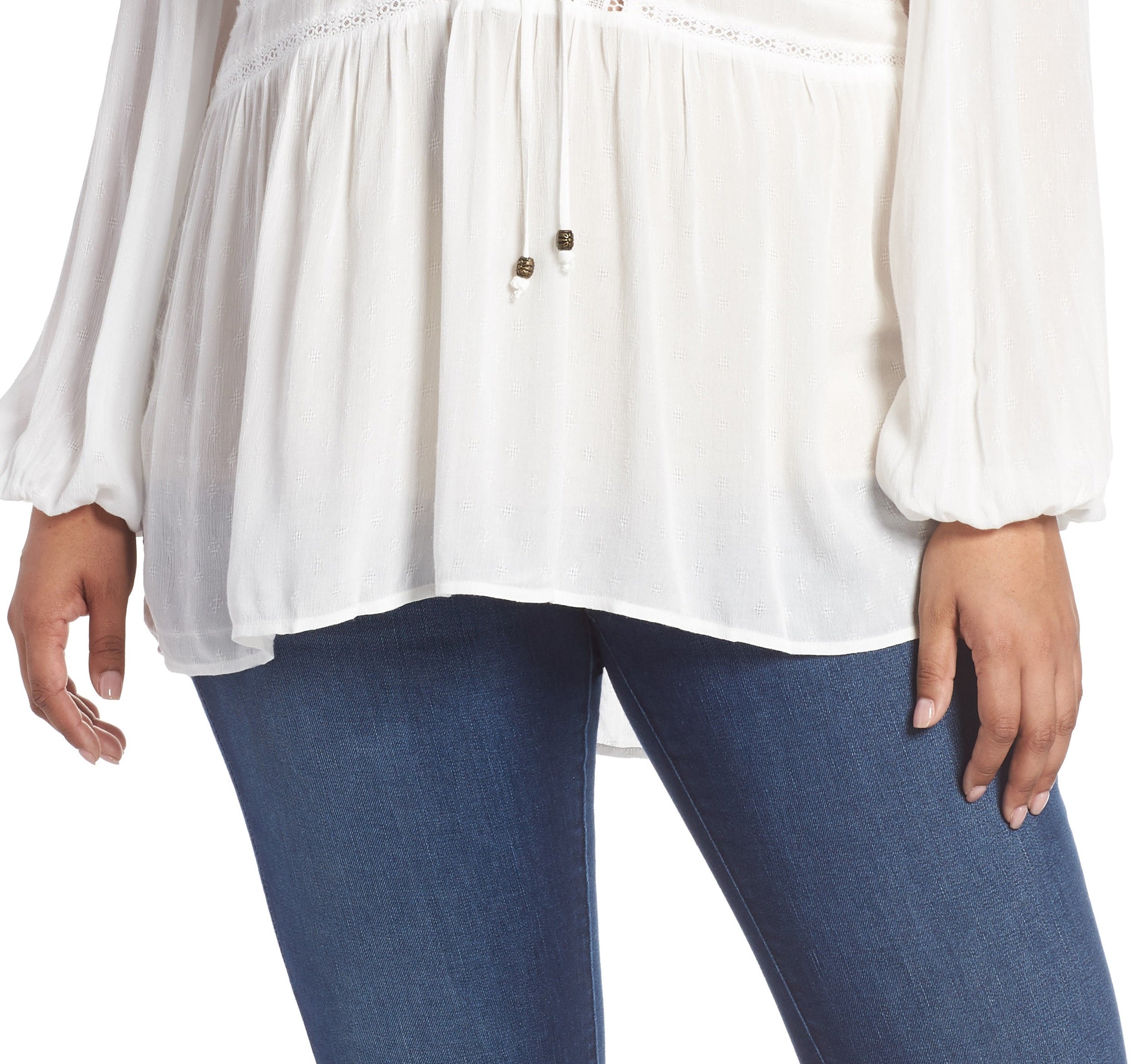 Acabamento em crochê modela o corpete e a cintura de um top babydoll plus size com cadarço da Seven7 Jeans. | Acabamento em crochê na frente | Punhos franzidos | Importado | Transparente; use com camadas | Decote em V com detalhe de cadarço com miçangas |