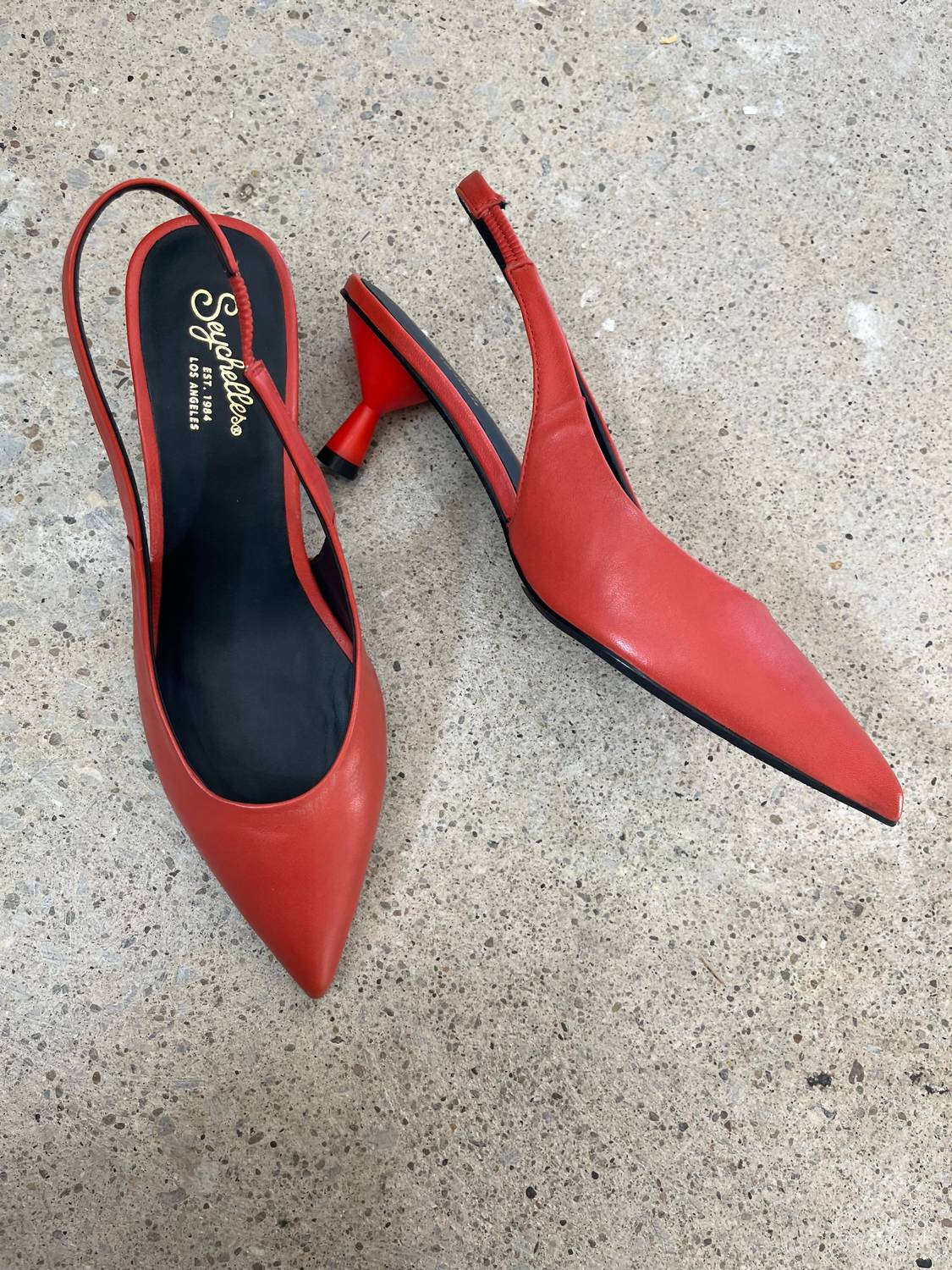 Unveiling the Women's Brooklyn Leather Kitten Heel Sandal by Seychelles in a striking Tomato red, a must-have for any minimalist wardrobe. These pointed-toe slingbacks feature a low kitten heel with a height of 2 inches and a flattering vamp, offering both chic style and comfort. Made from premium leather, they are crafted for an almond toe shape and a slip-on style for easy wear. Perfect for special occasions like anniversaries, these sandals seamlessly blend elegance and practicality.