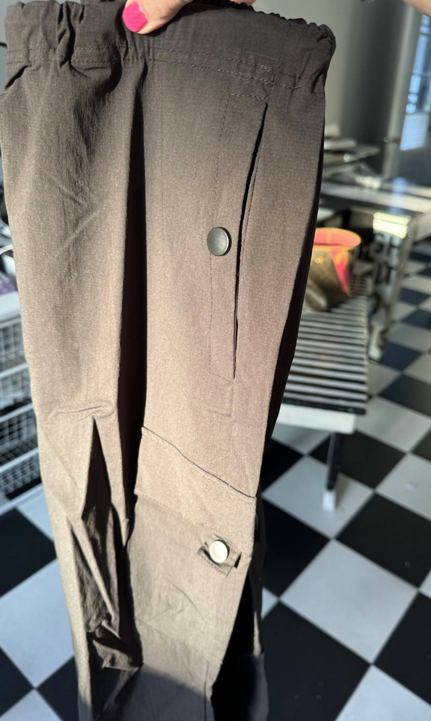 NYLON MAXI WITH ELASTIC DRAWSTRING WAIST, SIDE SLIT POCKETS, CARGO POCKETS ON BOTH SIDES, A DEEP BACK SLIT FOR EASY WALKING AND BLACK HARDWARE SO YOU CAN WEAR WITH ANY COLOR JEWELS. WEAR IT WITH A BEAUTIFUL DRESSY BLOUSE AND PUMPS OR BOOTS, A TANK AND FLIPS OR A SWEATSHIRT AND SNEAKS AS WELL.