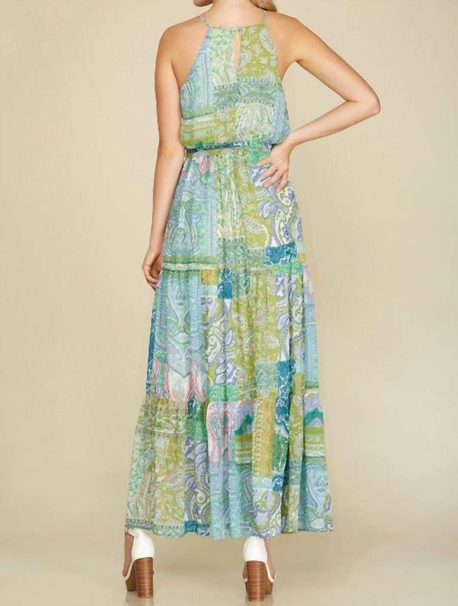 Embrace effortless elegance with the Chiffon Patchwork Tiered Maxi Dress by SHE + SKY, perfect for spring and vacation occasions. This sleeveless, A-line silhouette features a striking Lime/Blue pattern and a comfortable elastic waist, designed for warm weather style. Crafted from 100% Polyester with a breathable and lightweight chiffon construction, this dress offers an excellent drape for day-long comfort. Closure: Pull on. Care: Hand wash and line dry.