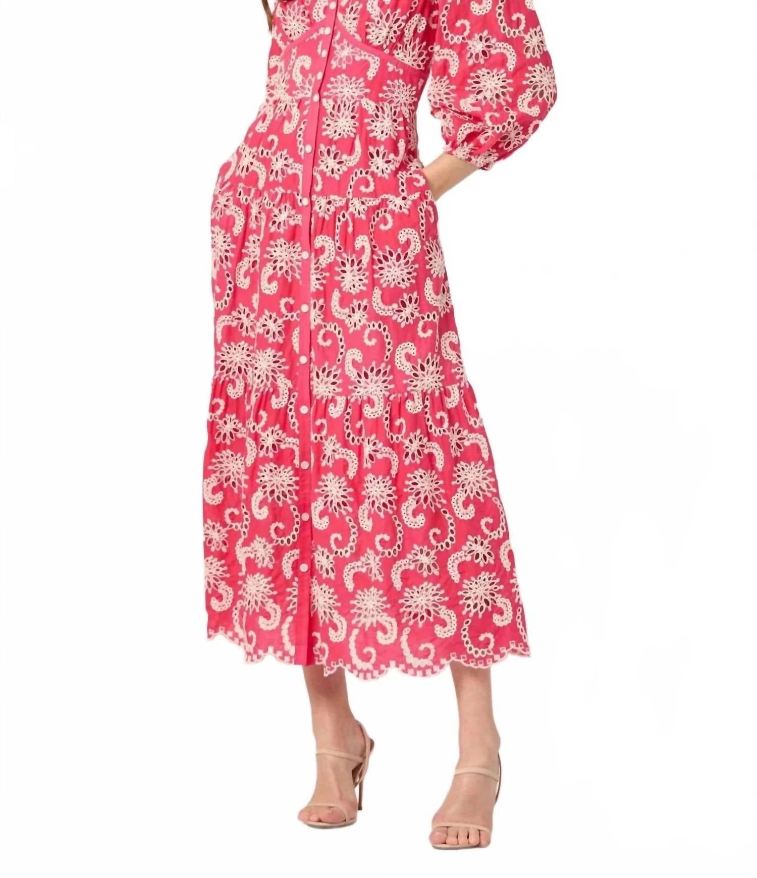 Just add slides or mules and you are good to go. Elevate your daytime ensemble with the Sicily Midi Dress by Shoshanna, a stunning raspberry and ivory piece perfect for spring occasions. This dress features three-quarter blouson sleeves, a V-neck, and an elegant A-line silhouette. Crafted from 100% cotton, it includes an empire waist and convenient on-seam pockets for practicality. Closure: Button closure. Made with care for your comfort, this dress should be dry cleaned to maintain its beauty. Hem falls below the knee.