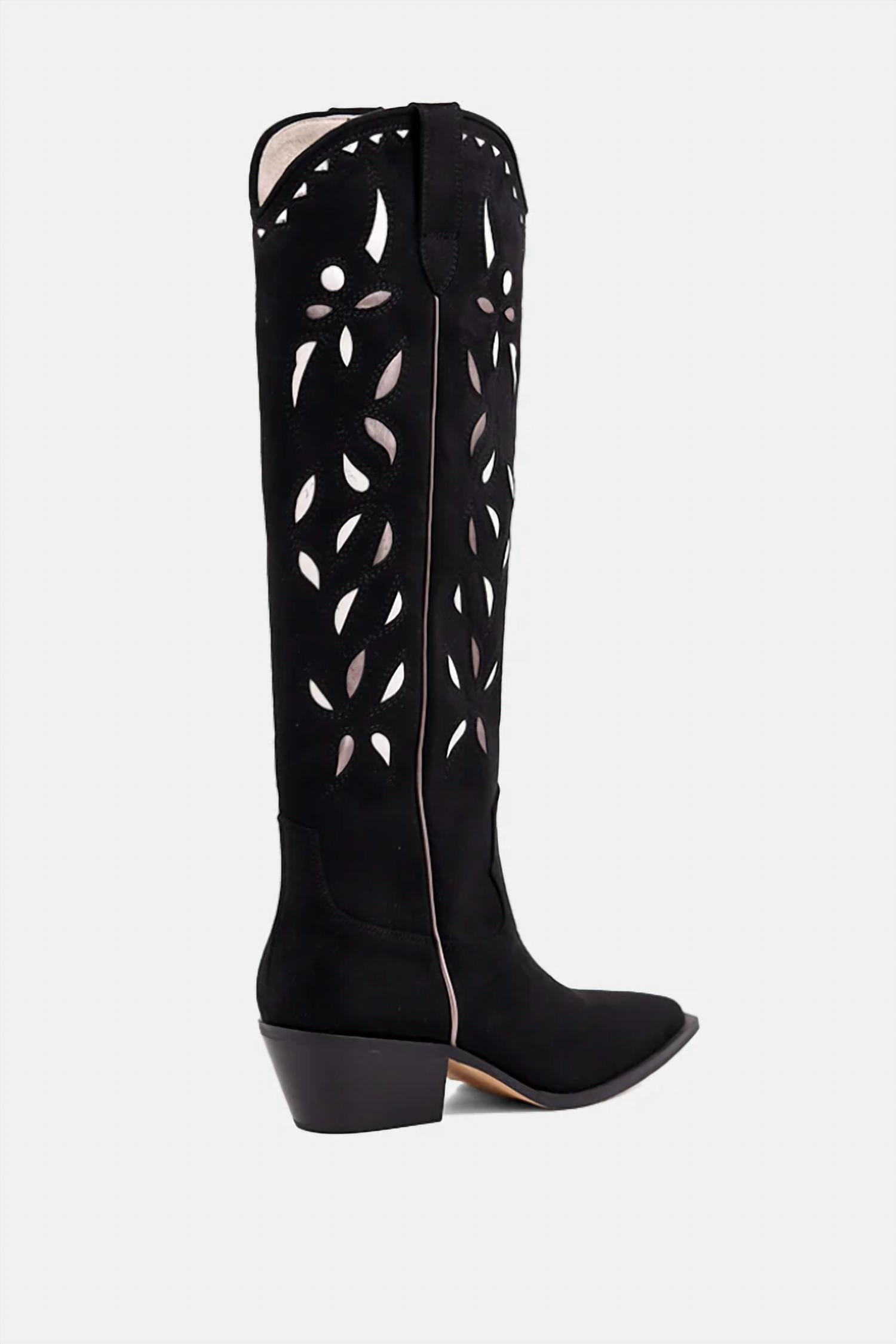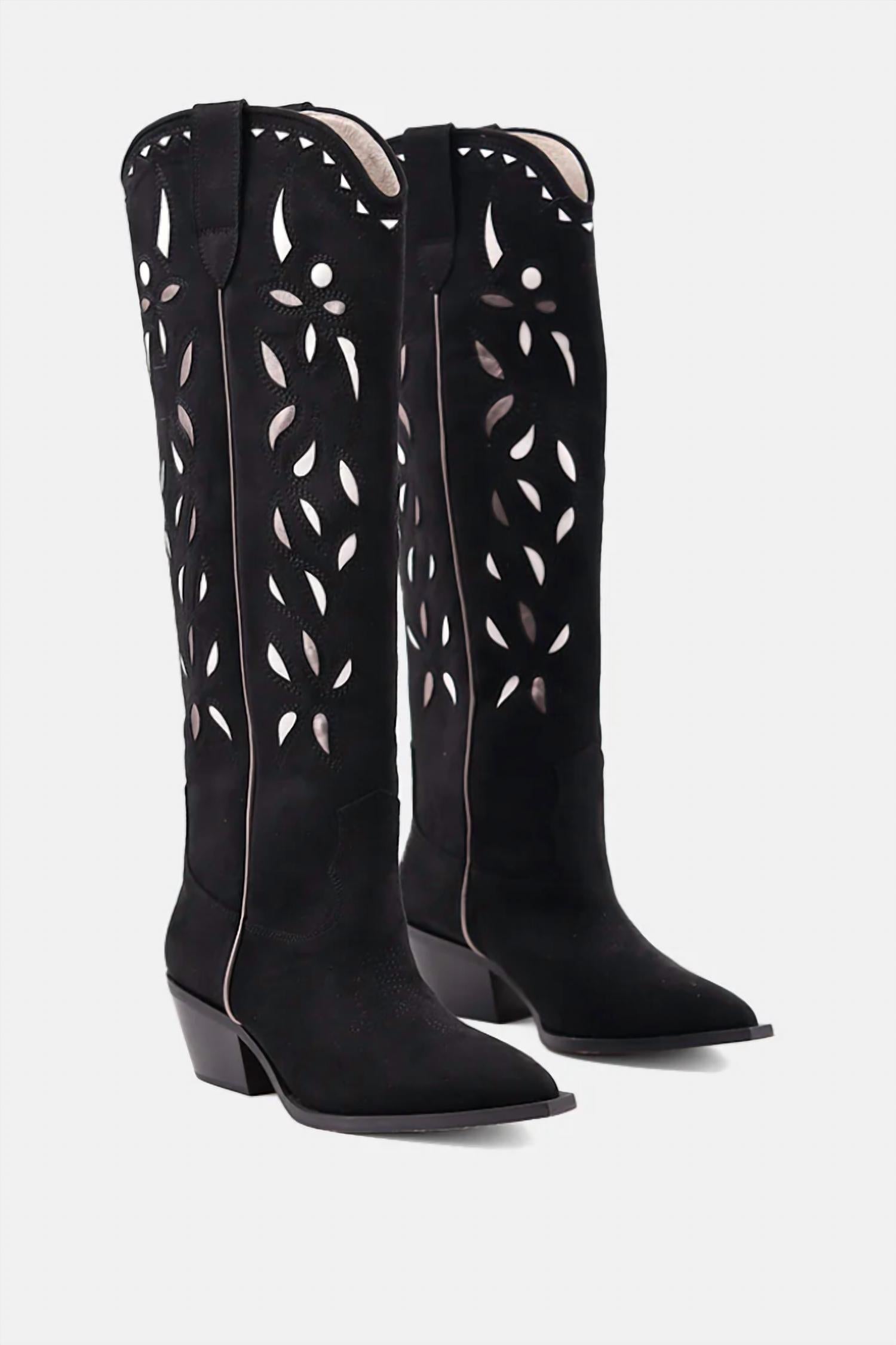 Estas botas estilosas acima do joelho ficam ótimas com jeans, vestidos ou saias. Não tem como errar! Apresentamos a Bota Feminina Zooey Cowboy de Cano Alto da SHU SHOP, uma escolha ousada para a mulher antenada na moda. Confeccionadas em camurça preta com recortes chamativos em couro sintético branco, estas botas apresentam um modelo clássico de inspiração western com um toque moderno. Projetadas com um salto bloco confortável, elas garantem estilo e praticidade para o dia todo. Perfeitamente versáteis, estas botas elevam qualquer look casual sem esforço.