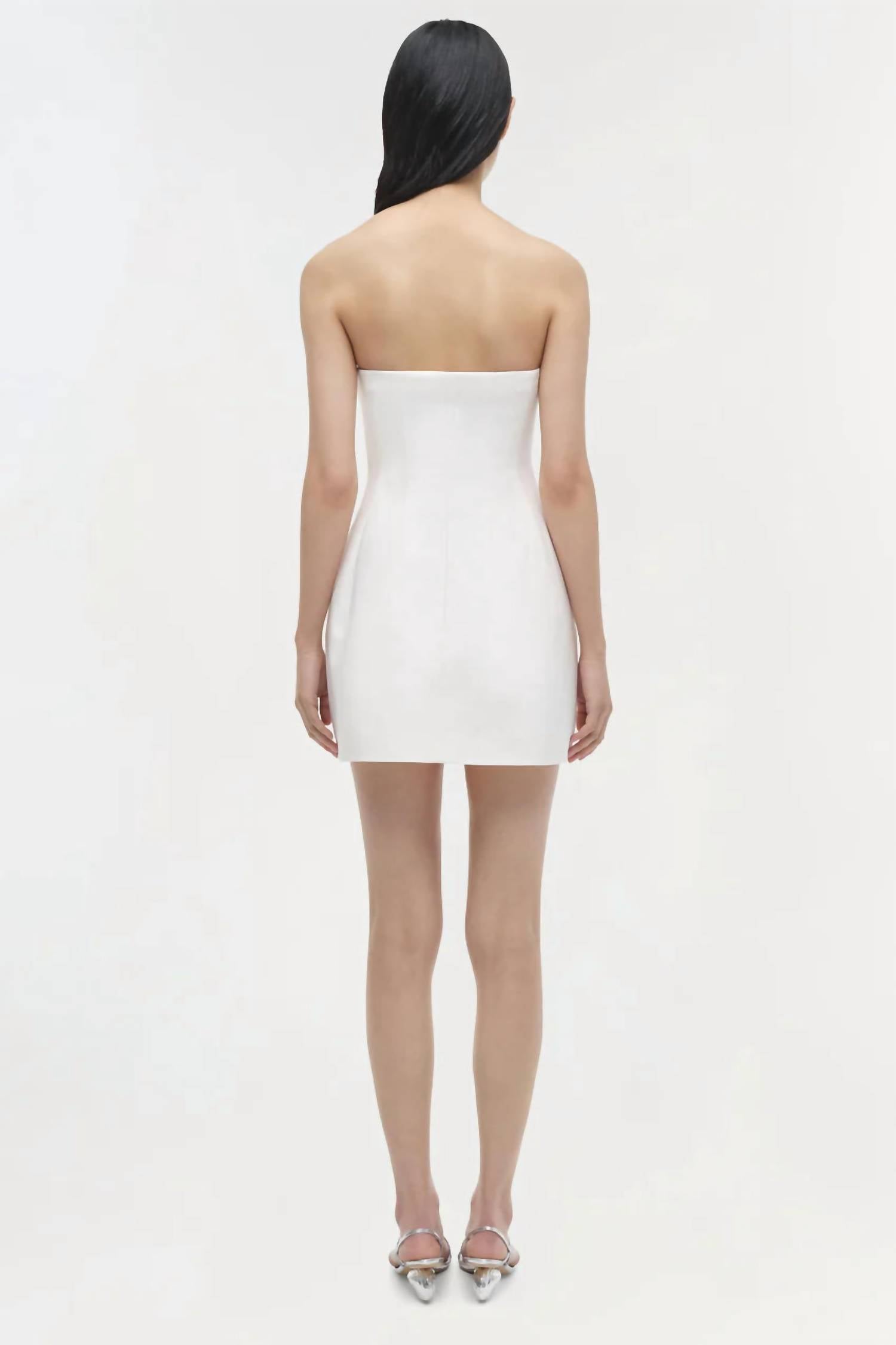 Introducing the Arta Bustier Mini Dress by SIMKHAI in timeless white, a sophisticated choice for any minimalist wardrobe. This sleeveless dress showcases a structured bustier design and an A-line silhouette made from a smooth 55% acetate and 45% polyester blend. The side zipper closure ensures a perfect fit, while its full lining combines 85% polyester/15% spandex and 100% polyester for added comfort. Proudly crafted with meticulous attention, it is recommended to dry clean only to maintain its luxurious finish.