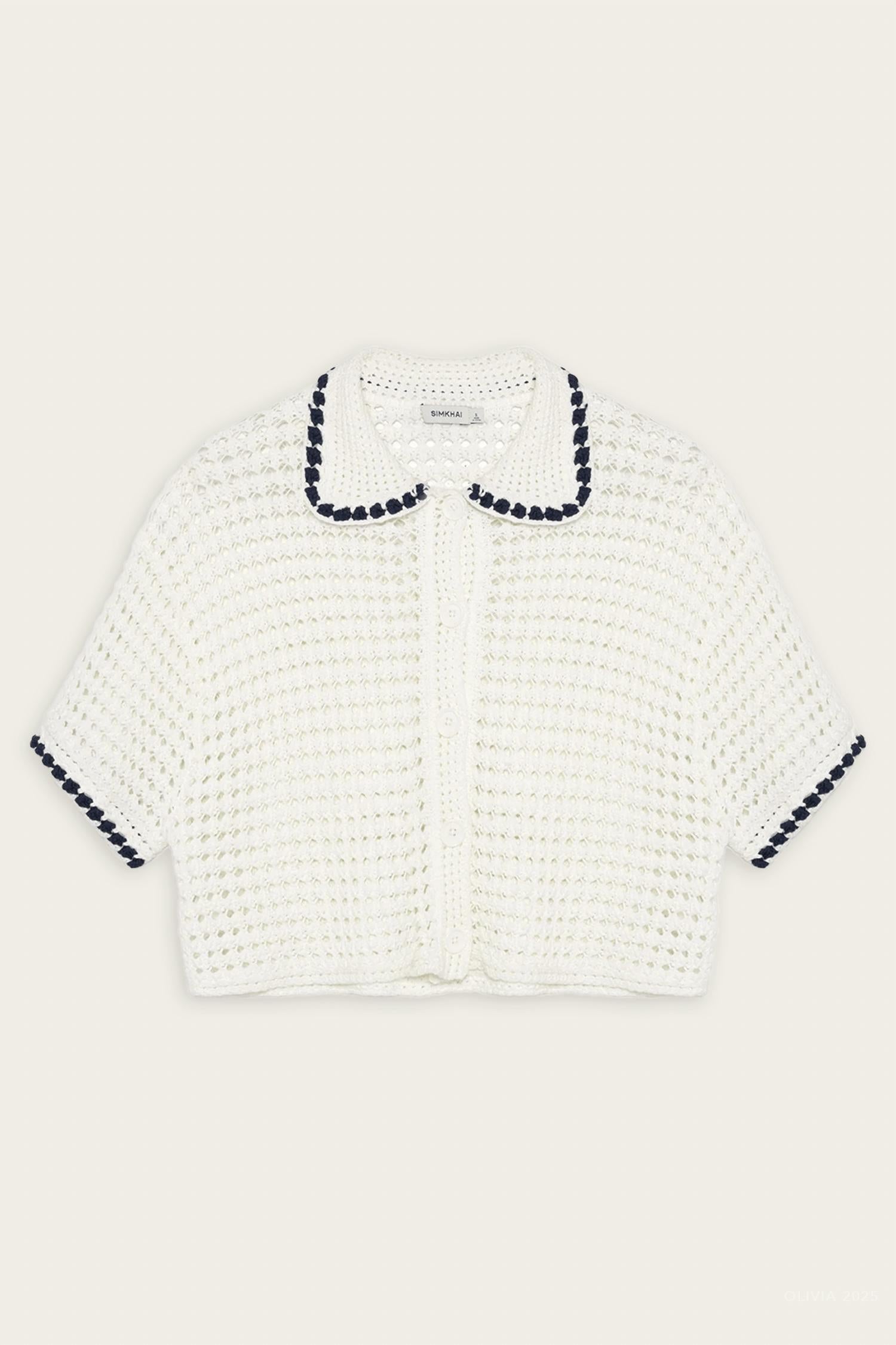 Elevate your wardrobe with the Shiloh Knit Shirt by SIMKHAI, a chic option for your spring wardrobe. This shirt showcases a classic ivory hue and features short sleeves, perfect for warm weather. Crafted from a blend of 58% Cotton and 42% Polyester, it combines comfort with durability. Closure: Button closure. Imported with care instructions recommending machine wash and tumble dry for easy maintenance.
