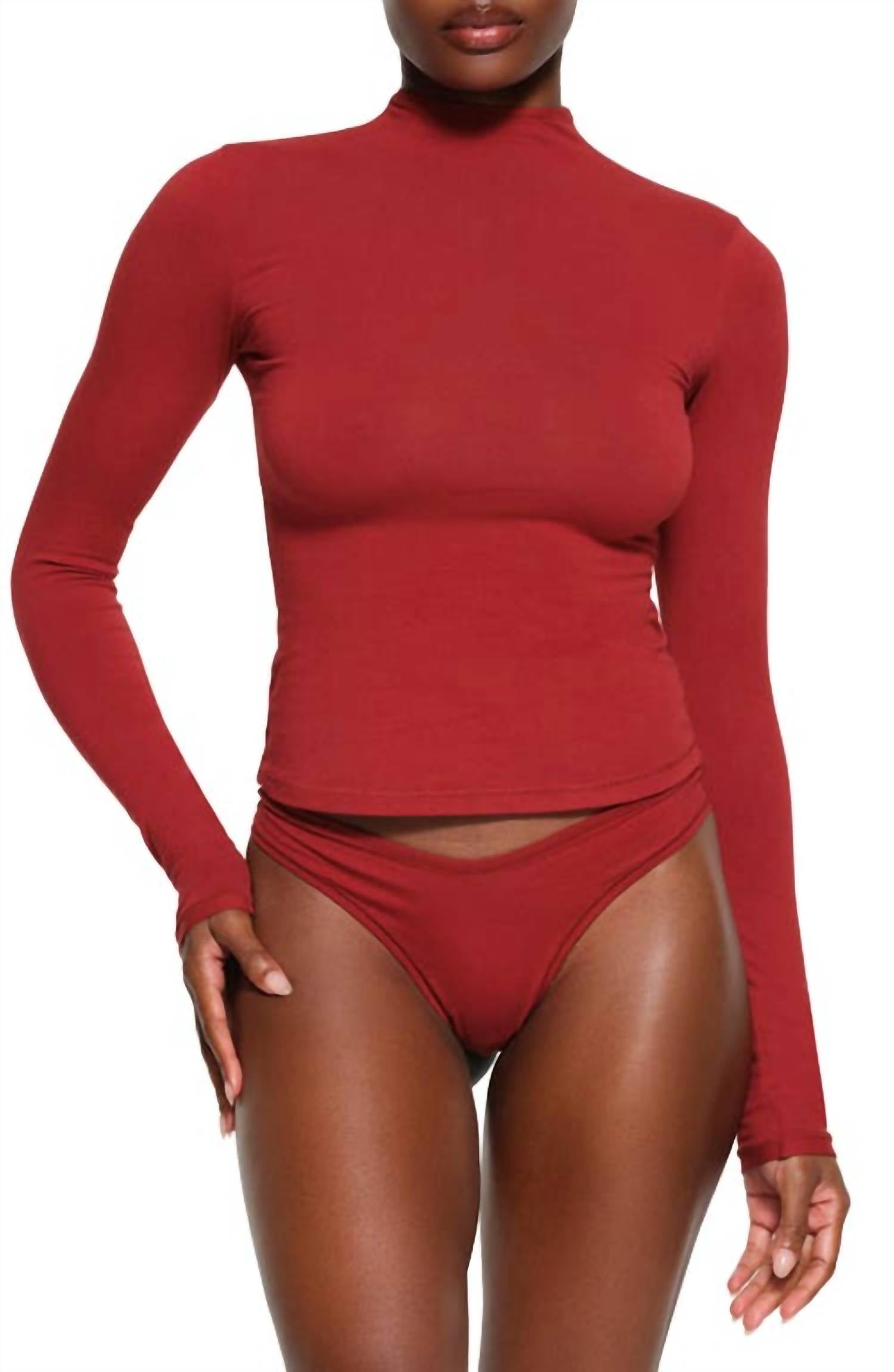 Caimento perfeito, design charmoso, tecido macio. Você vai adorar tudo nesta camiseta de manga comprida. Apresentamos a Blusa de Gola Alta de Manga Longa em Jersey Elástico de Algodão da SKIMS, uma peça essencial e elegante em um tom tijolo quente. Confeccionada com maestria em mistura de algodão, esta blusa oferece elasticidade confortável, perfeita para usar em camadas ao longo das estações. Ideal para ser usada sozinha ou em camadas, seu design sem costuras não possui bolsos ou fechos, enfatizando a simplicidade e a praticidade. Eleve seus básicos com esta peça versátil de manga comprida, feita sob medida para mulheres que valorizam a elegância discreta.