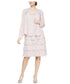 O vestido romântico com corte evasê da SL Fashions apresenta babados em camadas e miçangas brilhantes, com uma jaqueta combinando para usar por cima. Aproximadamente 37 de comprimento, do centro do pescoço até a bainha. O comprimento é baseado no tamanho 8 e varia 1/4 entre os tamanhos. Jaqueta; frente aberta; enfeites de miçangas nos ombros. Decote redondo com enfeites de miçangas. Silhueta com corte evasê. Modelagem sem alças.