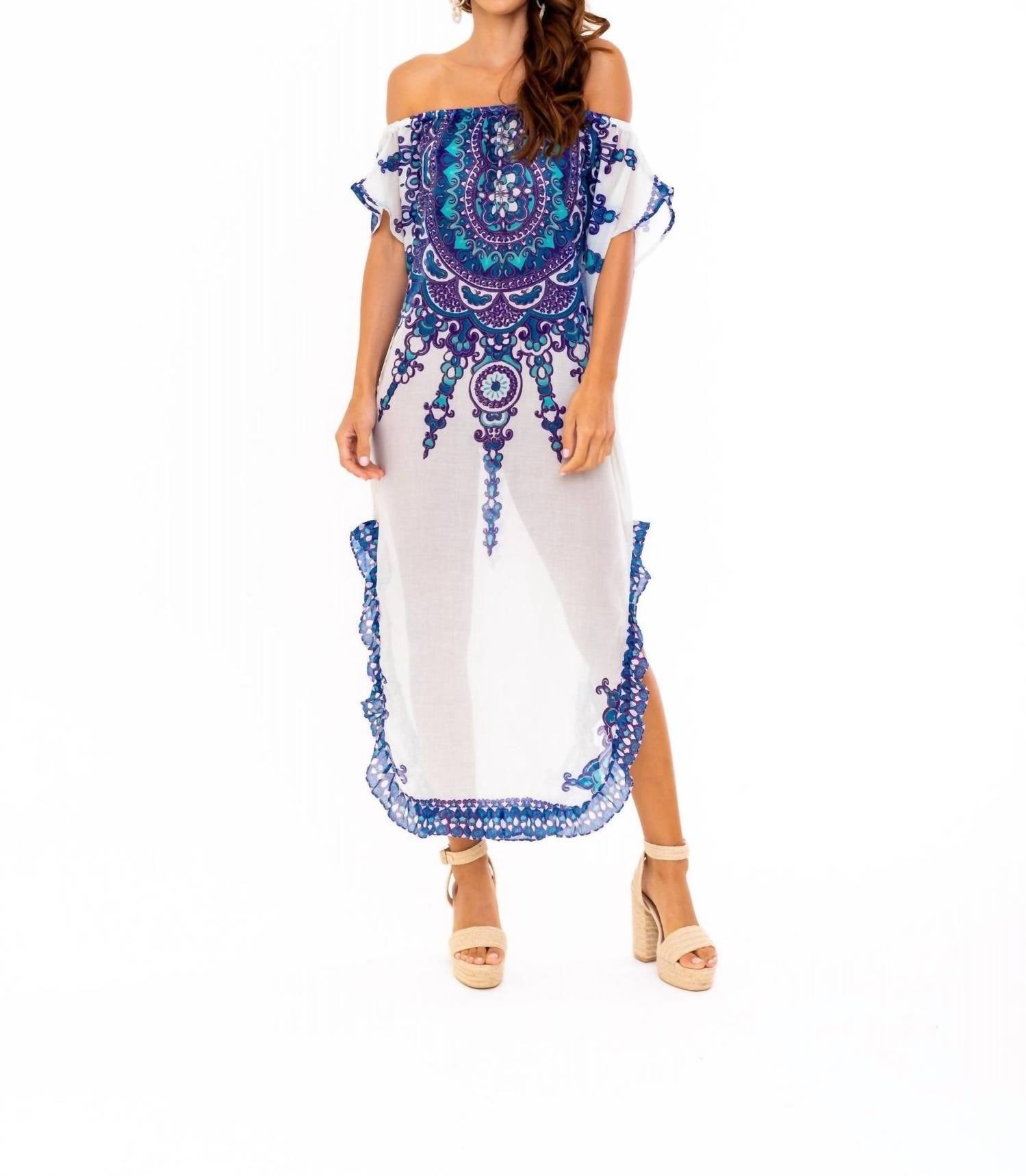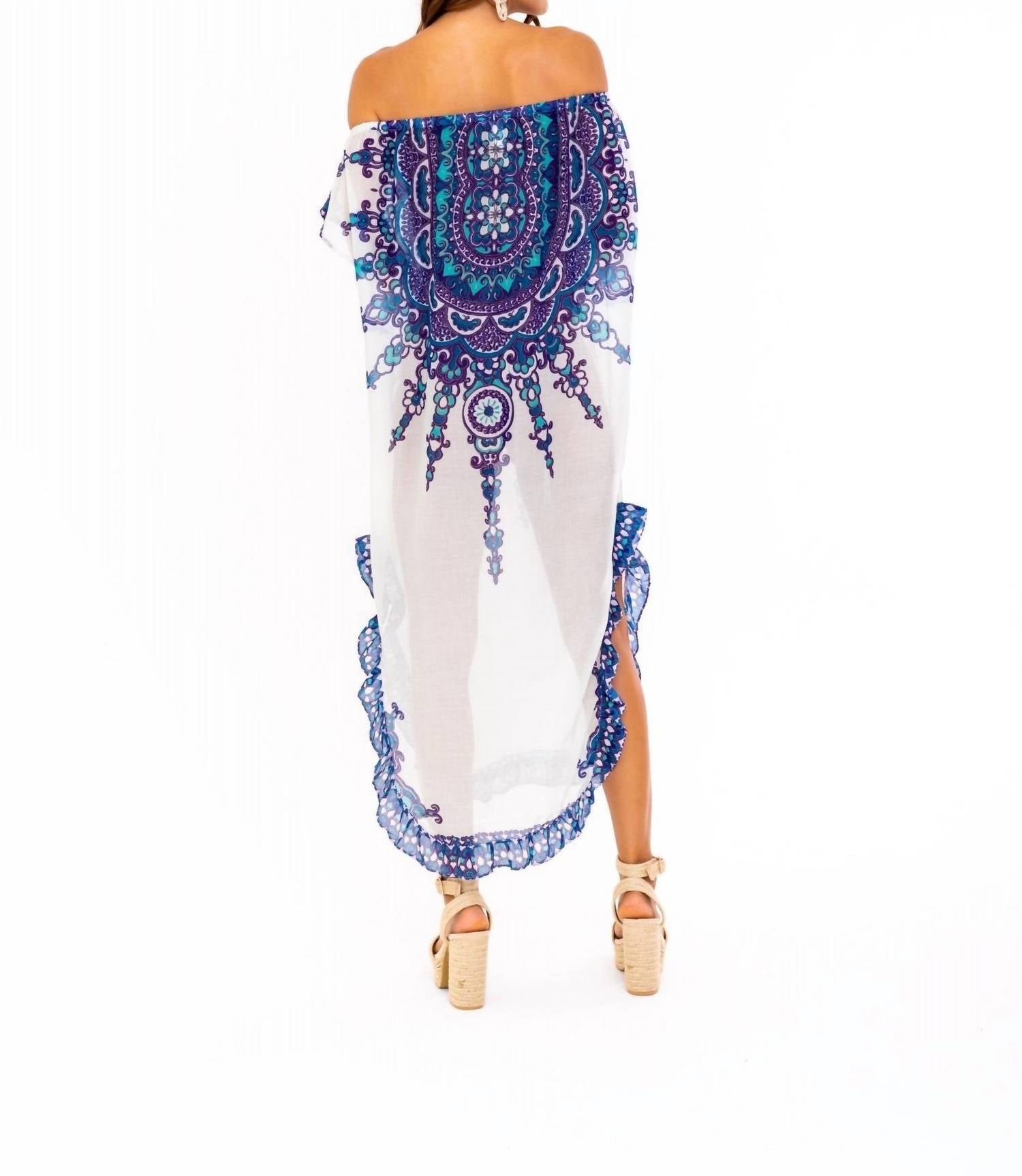 O vestido com o comprimento perfeito existe. Descubra o Caftan Ombro a Ombro Feminino SOAH em Azul Delphine, um item essencial para as férias de verão. Esta saída de praia estampada e sem mangas apresenta um estilo de gola quadrada com decote e bainha elásticos para um ajuste fácil ao vestir. Confeccionada nos EUA com 88% seda e 12% poliéster, esta peça de comprimento midi personifica as tendências maximalistas com sua silhueta em corte A. O cuidado é simples, lavando apenas à mão, e o tamanho é fiel ao tamanho para máximo conforto.