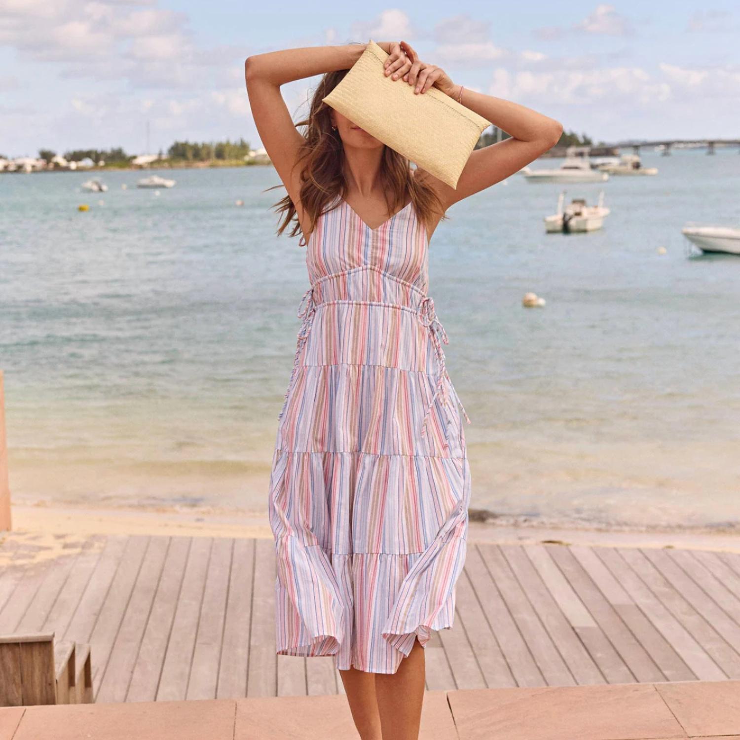 Eleve seu guarda-roupa sazonal com o Vestido Raquel da Southern Tide, um deslumbrante vestido midi na vibrante cor Azul Barco. Desenhado com alças finas e detalhes de gravata ajustáveis, este corte em A de 122 cm garante um caimento perfeito para qualquer festa de primavera ou festa de verão. Confeccionado em 100% algodão premium, apresenta um decote em V discreto e bolsos práticos na costura, proporcionando estilo e funcionalidade. As instruções de cuidado incluem lavagem à máquina com água morna e cores semelhantes, em ciclo suave, e secagem em temperatura baixa.