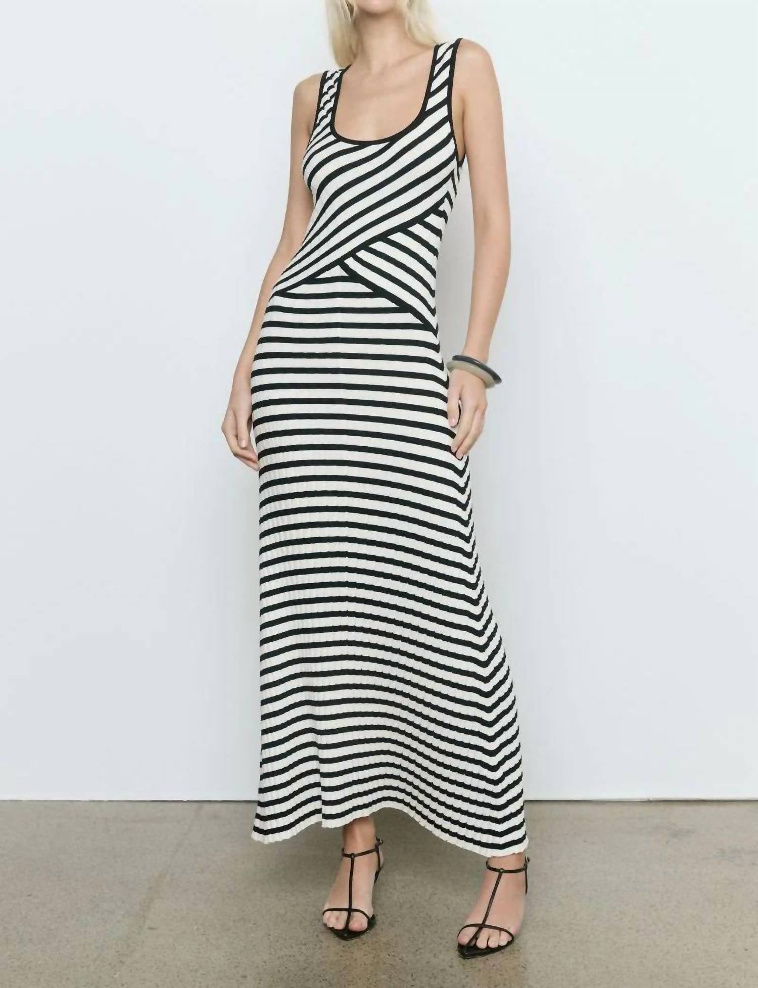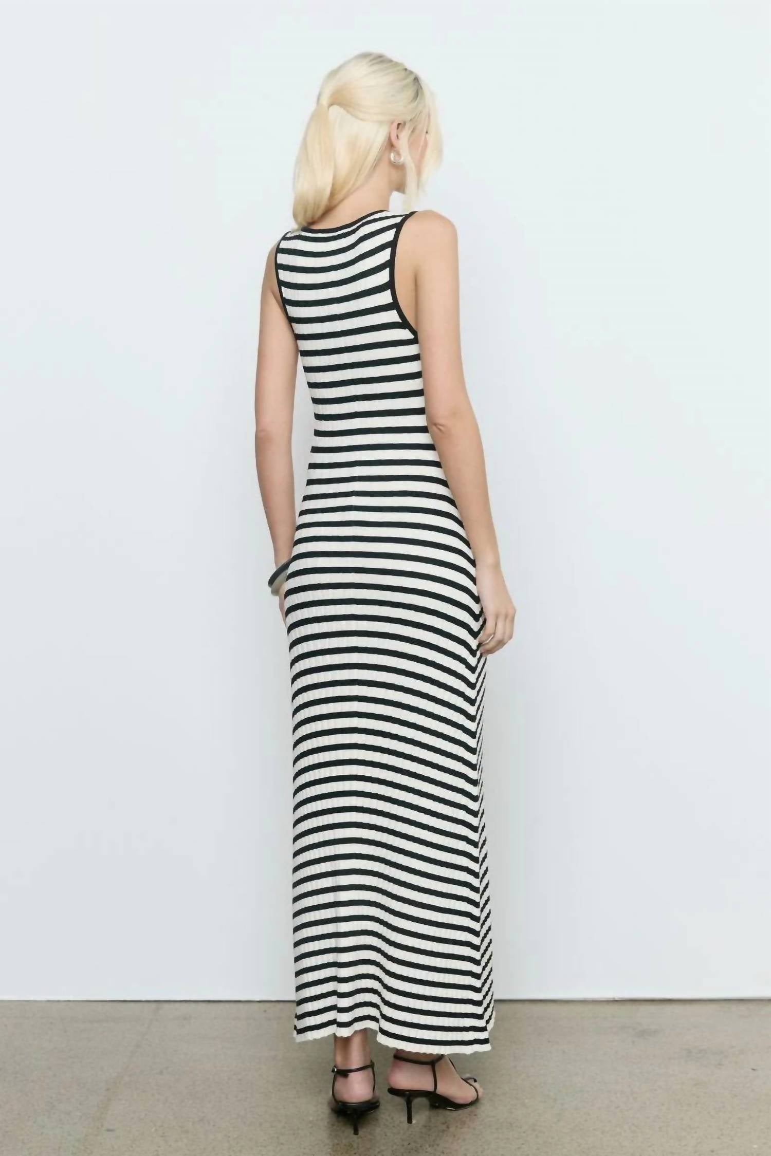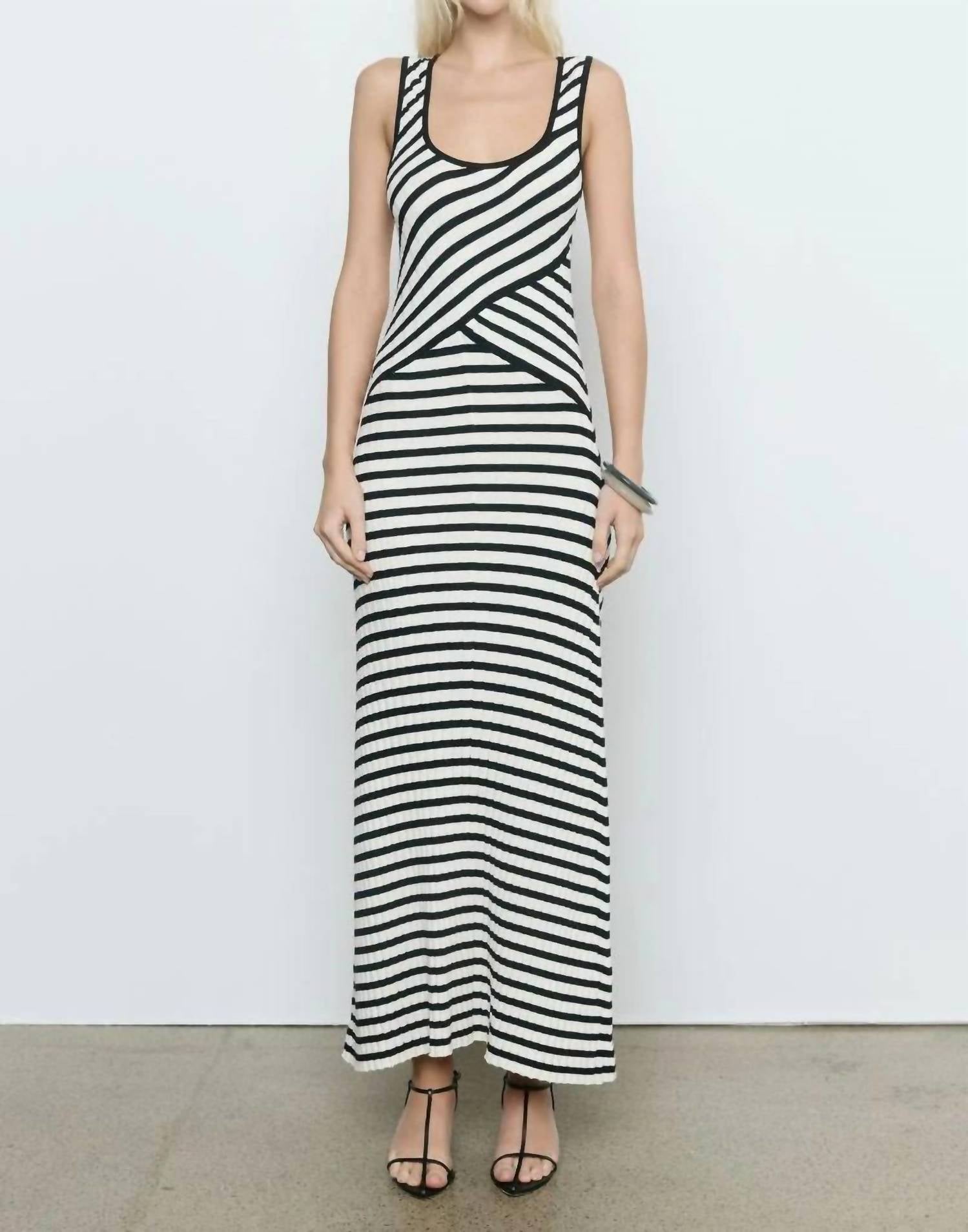 A maxi dress that is just as cute as it is comfortable. Discover the Women's Solene Stripe Knit Dress by SOVERE, a chic addition to your summer wardrobe in striking black and cream stripes. This sleeveless midi dress features a stylish scoop front neckline with a contrast bind finish around the neckline and armholes. Made from a luxurious viscose blend with a composition of 72% Viscose and 28% Nylon, this dress embodies minimalist elegance and is perfect for vacation outings. With a convenient pull-on closure, the sheath silhouette enhances a sophisticated look.