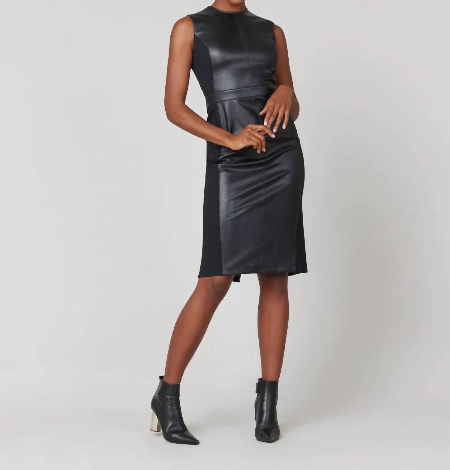 Introducing the Spanx Leather-like Combo Fitted Dress in Classic Black, expertly designed for a body-skimming silhouette. This sleeveless dress combines faux leather and ponte fabrics for flexibility and comfort, with a convenient zip closure. Length: 43" from shoulder to hem, hitting below the knee. Care: No need to dry clean.