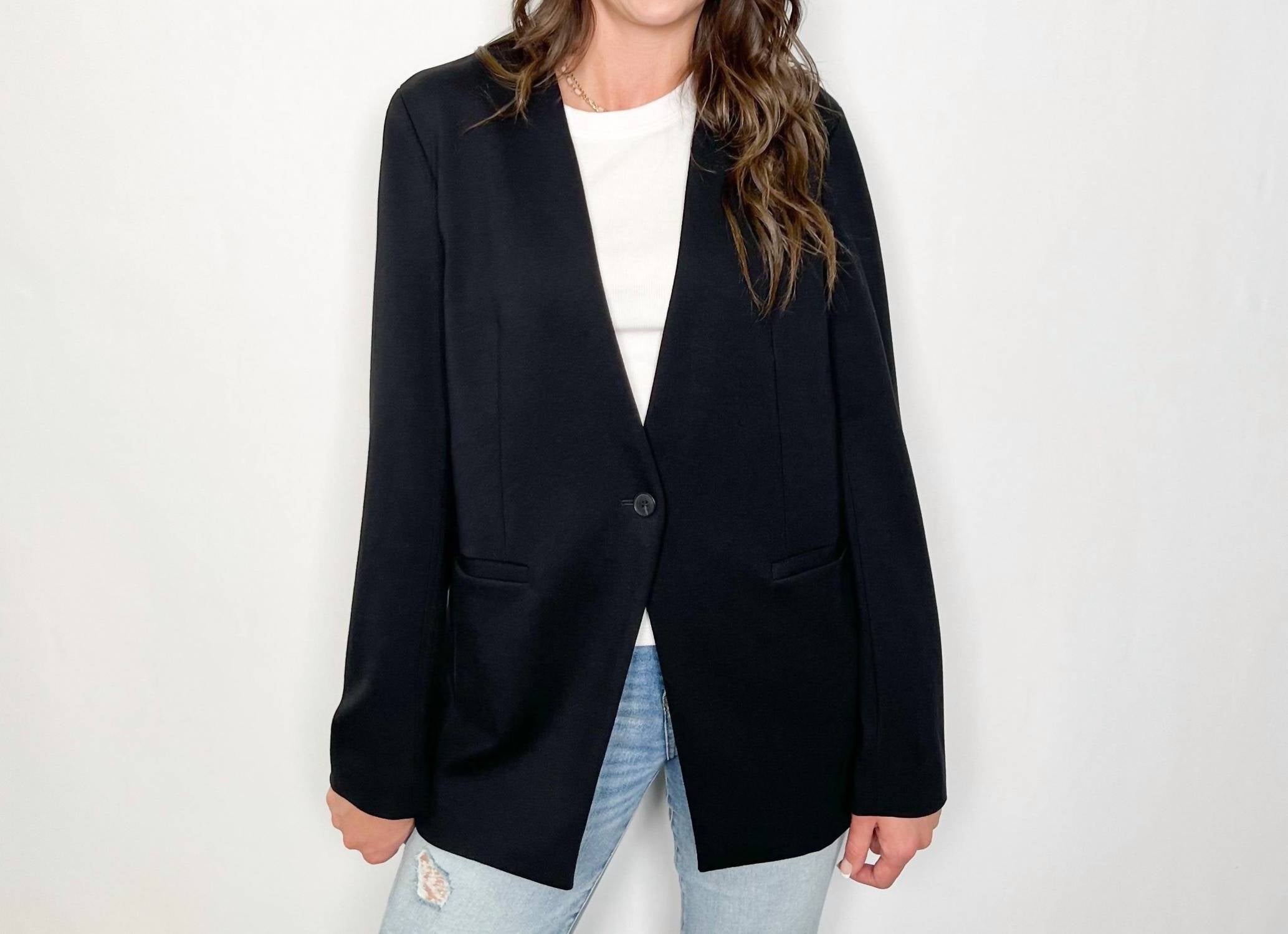 Feito sob medida para a perfeição, este blazer será sua jaqueta favorita por muitos anos. Conheça o "The Perfect Blazer" da Spanx, um clássico sofisticado em um tom Classic Black sofisticado, com mangas longas e gola alta. Este blazer feminino é confeccionado em tecido ponte premium, suave e com composição de 68% rayon, 28% nylon e 4% elastano, com elasticidade em 4 direções que promete conforto e estilo. Inclui bolsos funcionais e um prático fecho de botão para um acabamento elegante. Desfrute da facilidade de cuidado com a lavagem à máquina com água fria, do avesso e secagem no varal, tornando-o uma peça essencial para o seu guarda-roupa.