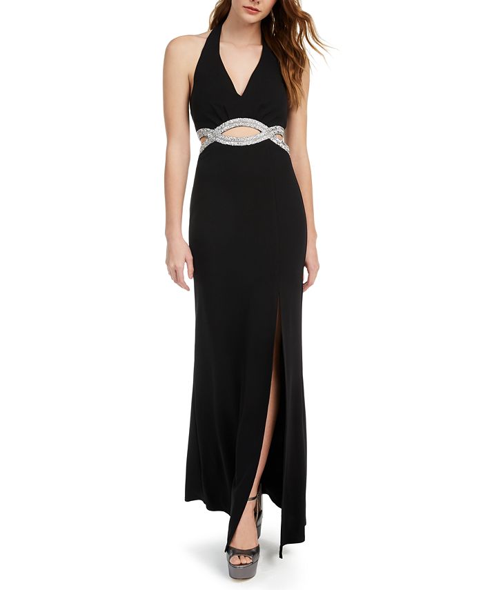 Aposte no glamour com o vestido de crepe estilo mergulho da Speechless, com decote halter e recortes brilhantes na cintura. Comprimento aproximado de 50 cm, do centro do pescoço até a bainha. O comprimento varia 5/8 cm entre os tamanhos. Decote halter em V; silhueta de vestido | Fecho de zíper nas costas | Bojos de sutiã; recortes na cintura com detalhes de enfeite; elástico na parte de trás do pescoço; fenda na bainha frontal.