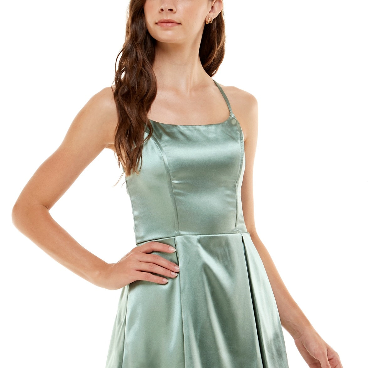 Ajustado no peito e na cintura; saia ampla e esvoaçante | Importado | Tecido acetinado; Brilhante e macio | Forrado | Detalhe de cadarço nas costas; bojos embutidos; pregas invertidas na parte frontal lateral e na parte traseira da cintura; bolsos laterais nos quadris | Alças ajustáveis cruzadas nas costas | Zíper no centro das costas