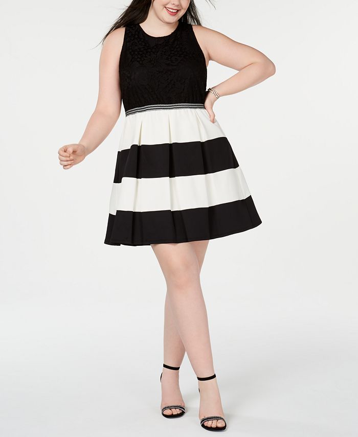 Arrase na pose com este vestido plus size justo e evasê da Speechless | com um lindo corpete de renda e listras ousadas na saia. | Comprimento aproximado de 89 cm, do centro do pescoço até a barra. O comprimento é baseado no tamanho 46 e varia de 1/2 entre os tamanhos | Decote redondo; modelagem justa e evasê | Fechamento por zíper nas costas | Renda no corpete; acabamento contrastante na cintura; listras na saia