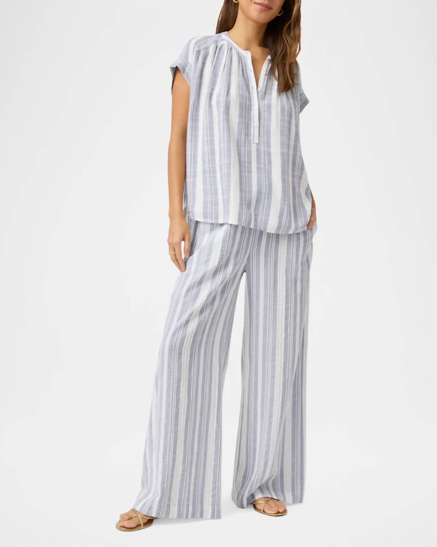 Abrace o estilo descontraído do verão com a Blusa Listrada Raegan da Splendid, com mangas curtas e um caimento macio e drapeado. Confeccionada em uma mistura de 84% viscose e 16% linho, esta blusa apresenta um design listrado em tons de branco e porto. Seu decote em V e meia abertura com botões adicionam um toque de charme litorâneo, perfeito para combinar com a Calça Raegan ou seu jeans favorito. Fechamento: Fechamento por botão. Cuidados: Lavar à mão e secar na horizontal. Ideal para escapadas de férias, esta peça minimalista traz uma elegância descontraída ao seu guarda-roupa de verão.