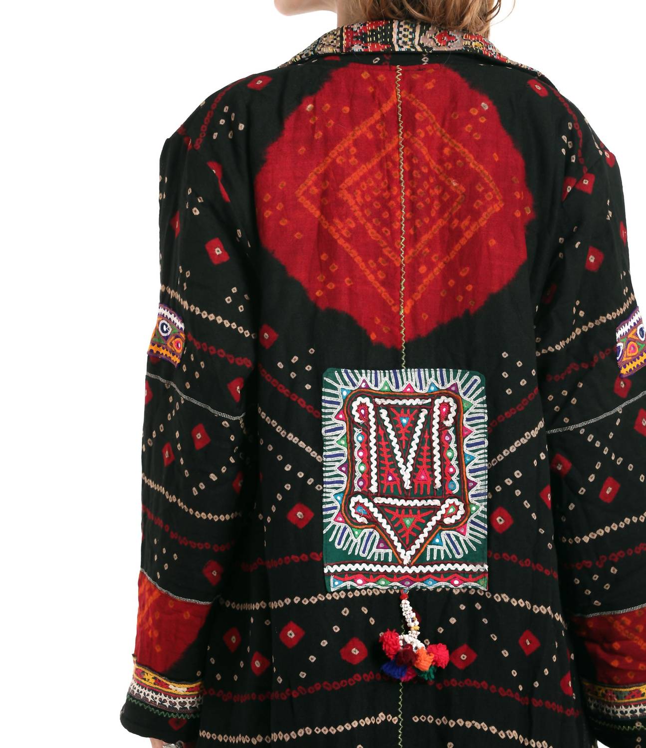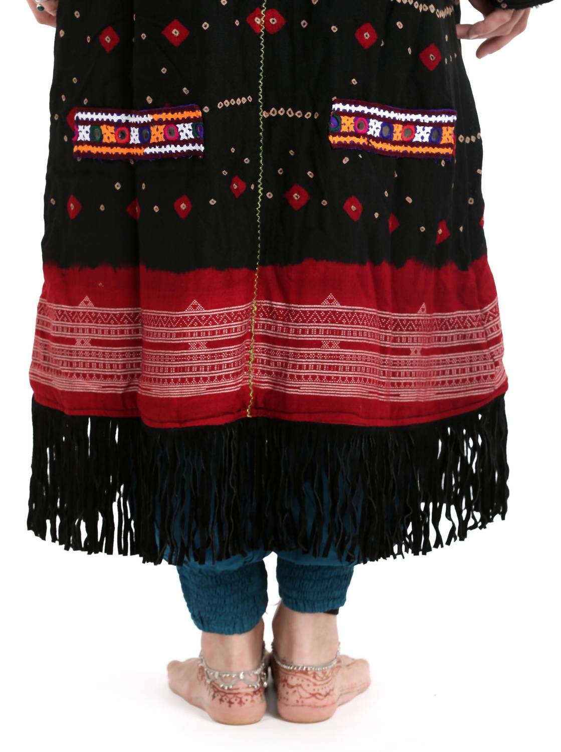 Introducing the StandAwt Signature Kimono Coat, a statement piece designed for those who seek uniqueness and style. This long-sleeve wonder is crafted from a mix of merino wool and cotton, with a luxurious faux fur lining, ensuring warmth and comfort. The reversible design in a striking black, red, and green pattern features a signature silk collar, leather fringe, and intricate hand-embroidered patches. Closure is via buttons, complete with ample pocket space, including a secret compartment, and it's fully sustainable. Care: Hand wash and lay flat to dry.