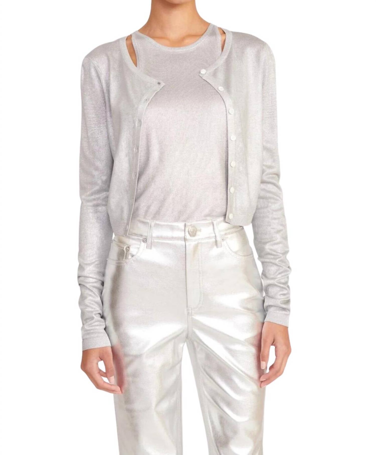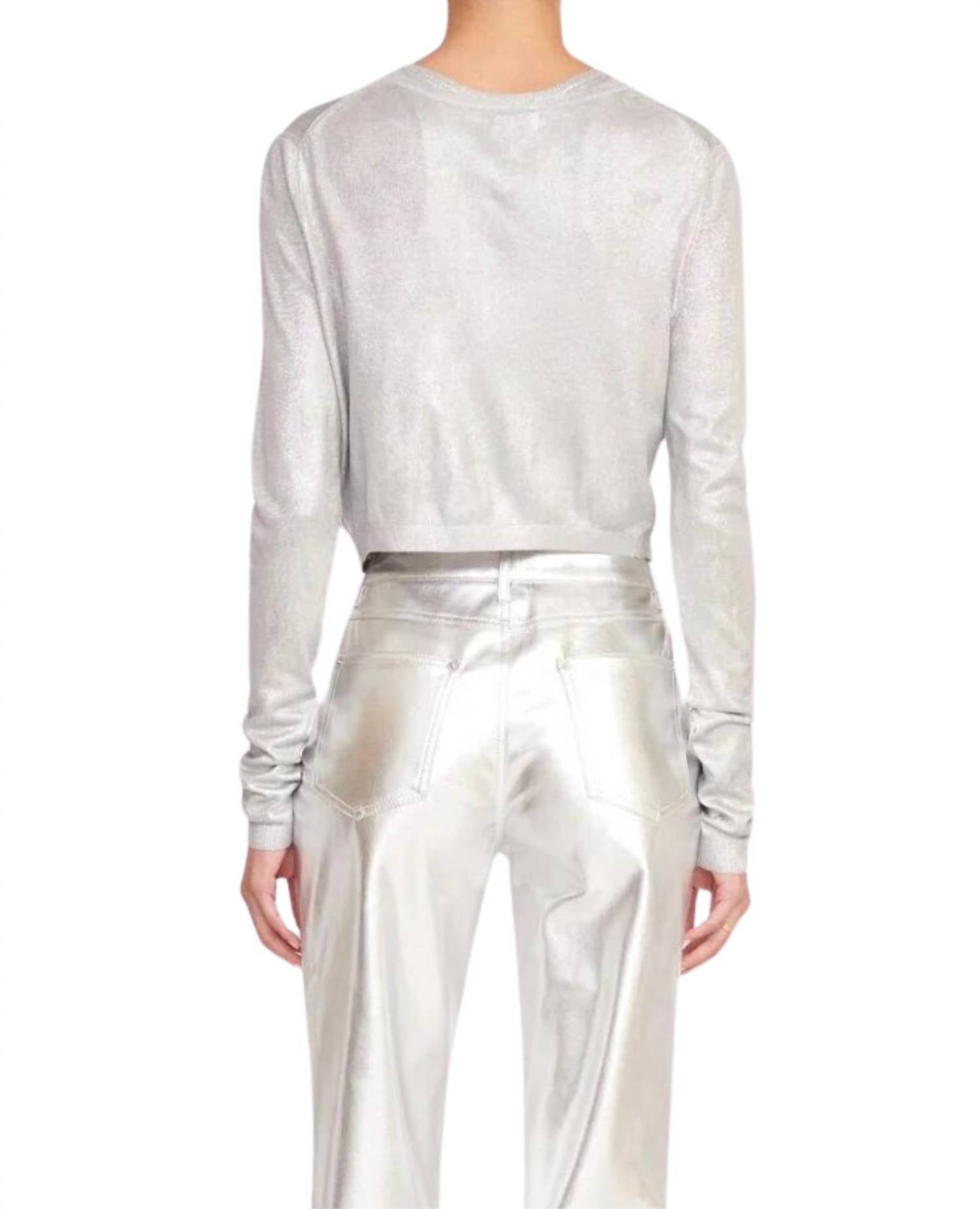 Use este adorável cardigan por cima de qualquer camisola ou regata. Elegância cintilante aliada ao estilo moderno. Confeccionado em 100% rayon metálico. Cardigan cropped. Apresenta um tom prateado deslumbrante. Gola redonda e tecido texturizado. Fecho de botões e mangas compridas. Oferece conforto e elegância. Fácil de cuidar, basta lavar à mão ou optar pela lavagem a seco.