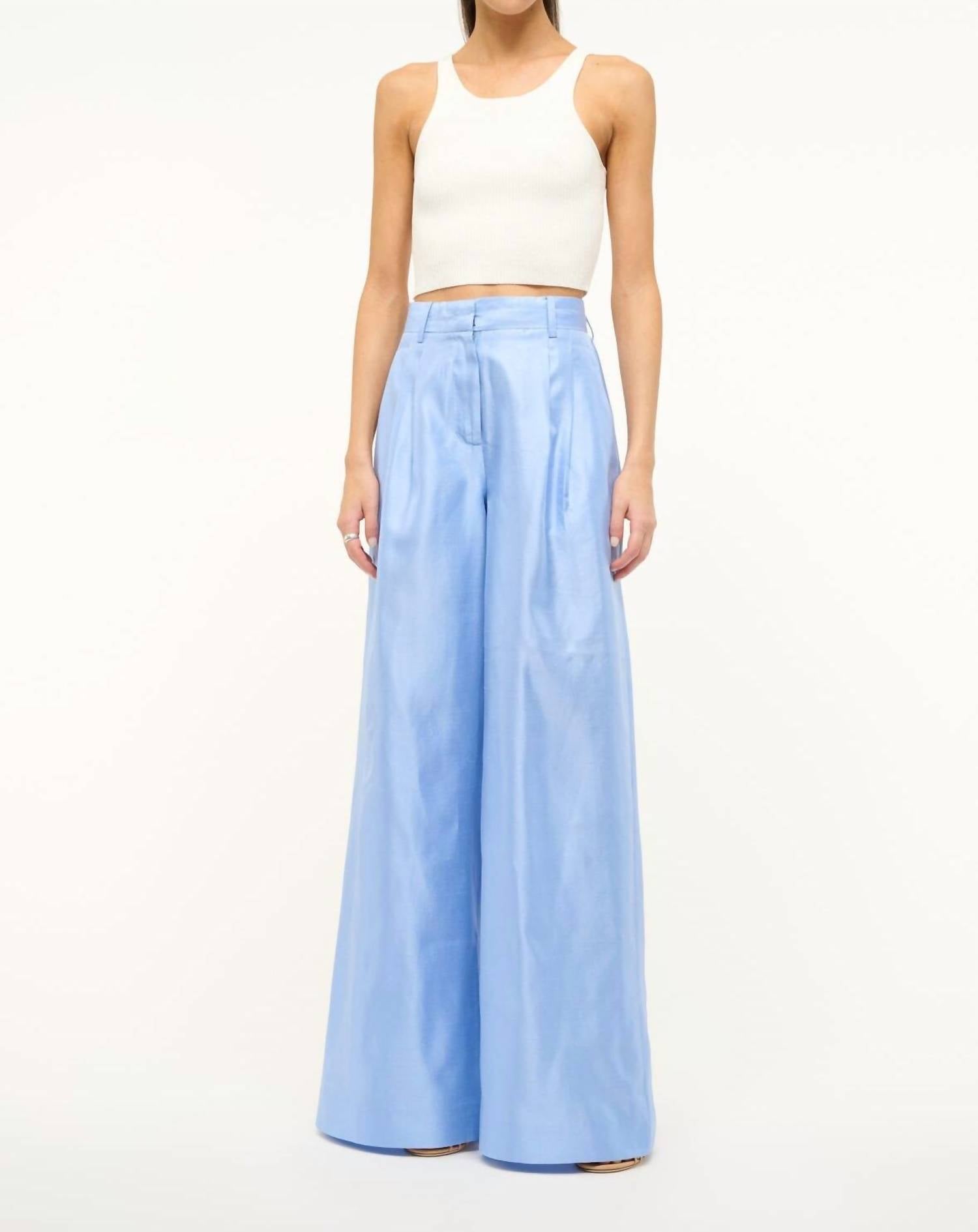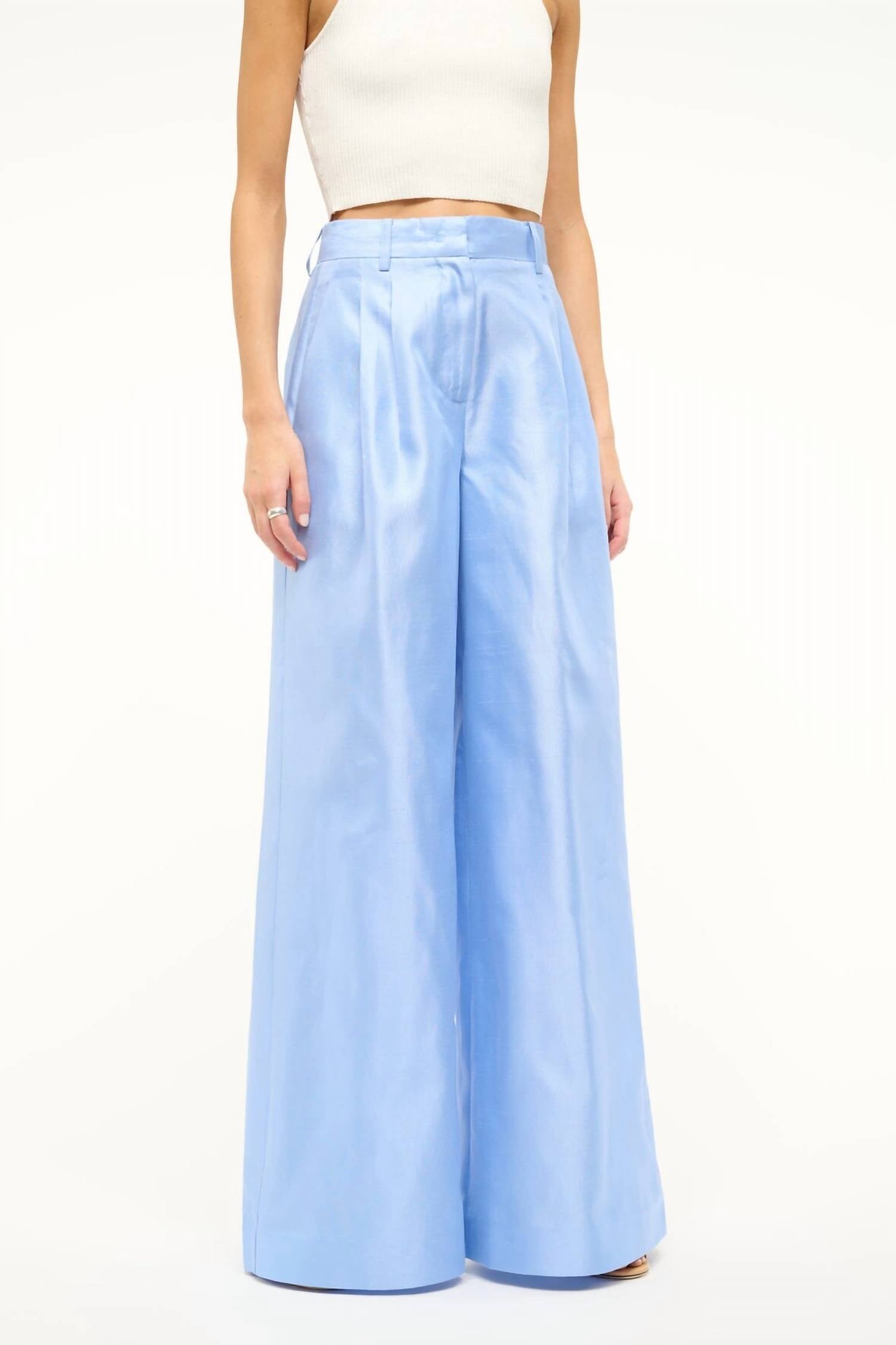 Discover the Sasha Wide Leg Pant by STAUD, a sophisticated choice in vibrant blue, perfect for a minimalist and elegant style. These trousers feature a solid pattern and are crafted from 100% crisp dupioni silk, offering a luxurious feel. With a convenient zip closure, front slash pockets, and back welt pockets, they're ideal for a dinner party or Thanksgiving gathering. Care for these pants by dry cleaning only, and enjoy pairing them with the Rochelle Top for a complete look. Model is 5'10" and is wearing a size 2.