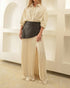 Introducing the Camelia High Fashion Set by Steffany Milano, a loungewear ensemble that captures quiet luxury and urban elegance. This beige set features a collar neckline and long sleeves, making it ideal for a stylish dinner party or New Year's Eve celebration. Crafted with a composition of 60% Polyester, 30% Rayon, and 10% PU Faux Leather, it includes a pleated maxi skirt and an oversized silky blouse, topped off with a bold faux leather belt. Designed for women who embrace a solid pattern and architecturally inspired style, this outfit effortlessly embodies a shift dress silhouette, perfect for the fall season.