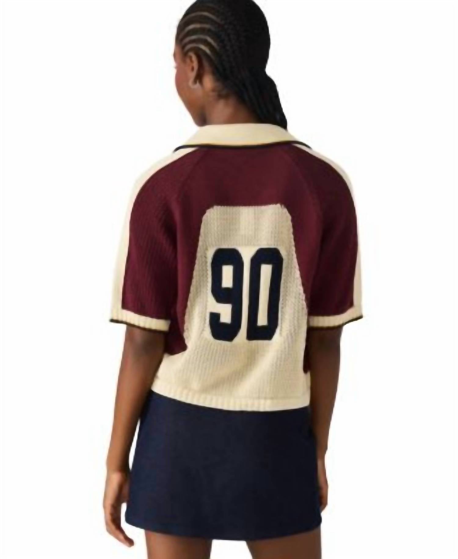 Elevate your streetwear style with the Steve Madden Women's Axon Sweater, featuring a vintage varsity-inspired design in a striking multi maroon yellow colorway. This textured cardigan boasts a classic collar and short sleeves with a distinctive single stripe, perfect for a summer vacation or a laid-back occasion. The mixed media design sits comfortably at the waist, while a playful number 90 adorns the back, celebrating Steve Madden's founding year. Closure: Pull on.