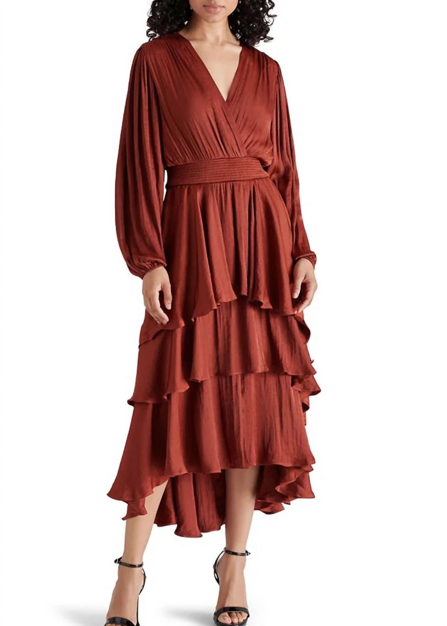 The Bei Dress by Steve Madden is a captivating choice for any event, with its long sleeves and luxurious, washed satin feel. This sophisticated wrap midi dress in the color Brick House features a V-neckline and a smocked waist for a flattering fit, complemented by a tiered skirt and functional side pockets. Made from polyester, this dress has a pull-on closure for effortless wear. Approximate garment length is 48 inches, and it requires hand washing to maintain its minimalistic elegance.
