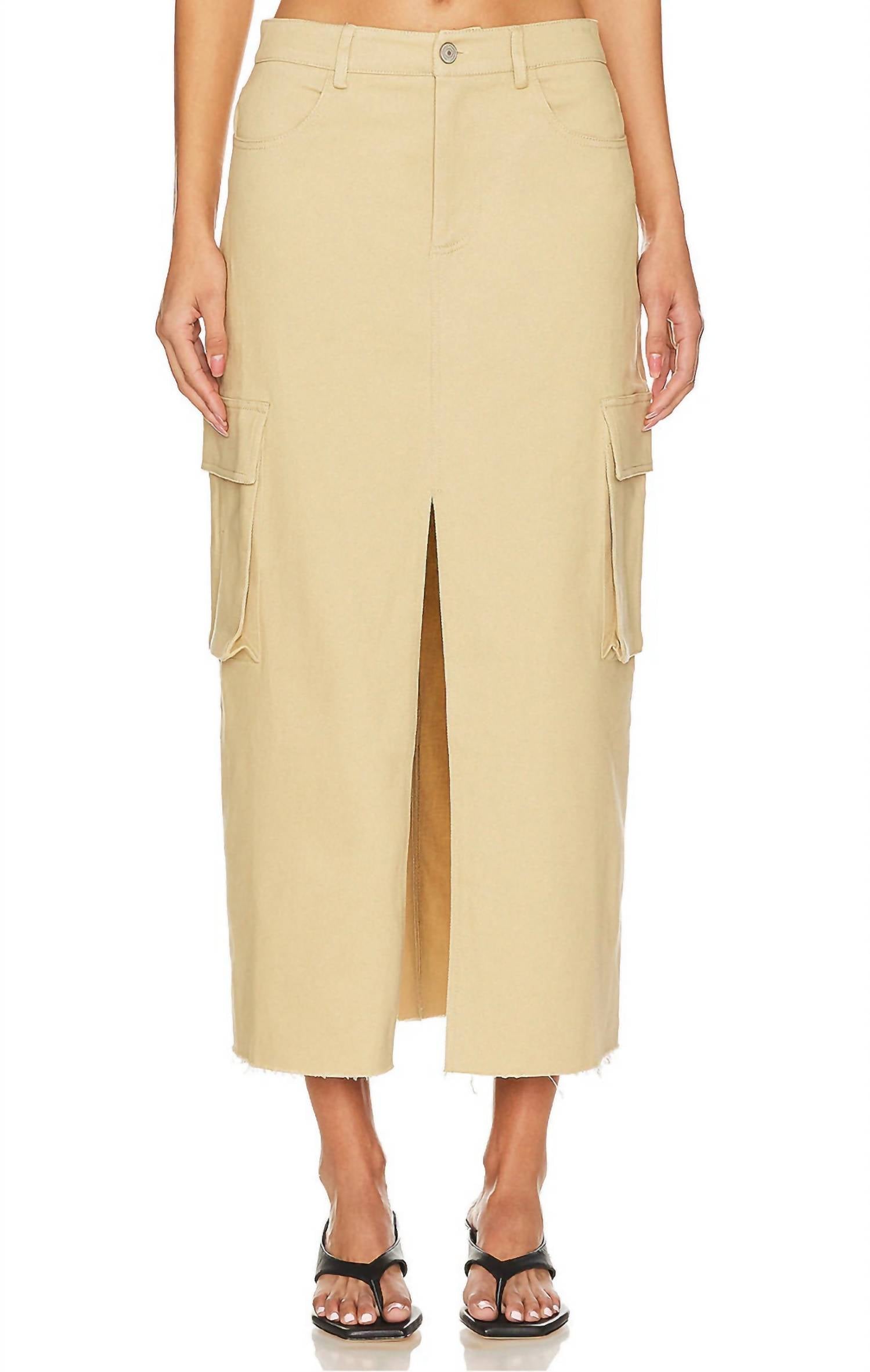 Show off just the right amount of skin in this beautifuly designed midi length skirt. Introducing the Benson Skirt by Steve Madden, a stylish addition to your wardrobe with a unique mushroom hue. Crafted from midweight twill fabric, this skirt is composed of 97% cotton and 3% elastane, providing comfort and flexibility. The 34" long design features practical cargo pockets and a playful raw-edge hem, with a zip fly and button closure. Imported, this unlined skirt promises both style and utility. Care: Hand wash.