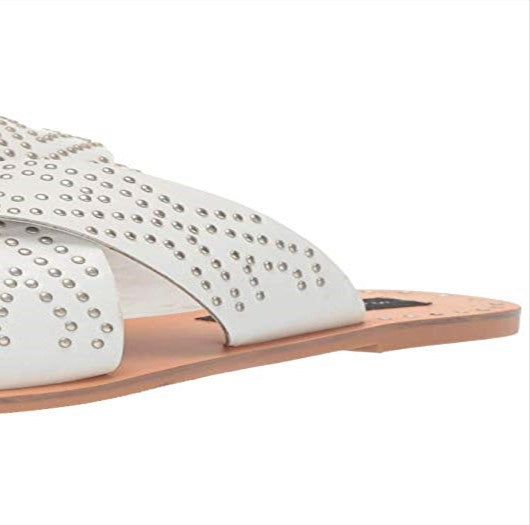 As tiras cruzadas com tachas exibem um toque de padrões geométricos no design discreto das sandálias femininas da STEVEN NEW YORK. | Salto 1/2 | Sandálias cruzadas com bico redondo e tachas | Design com tachas nas tiras | Cabedal em couro; forro sintético; sola de borracha | Importado