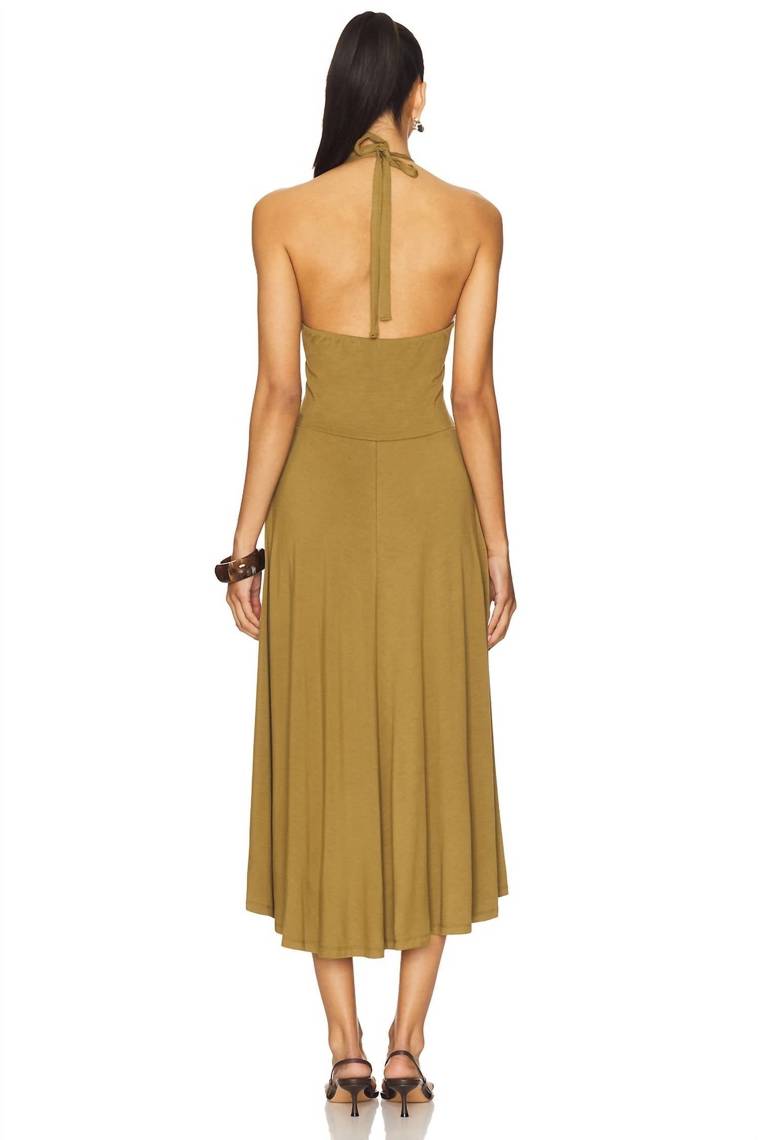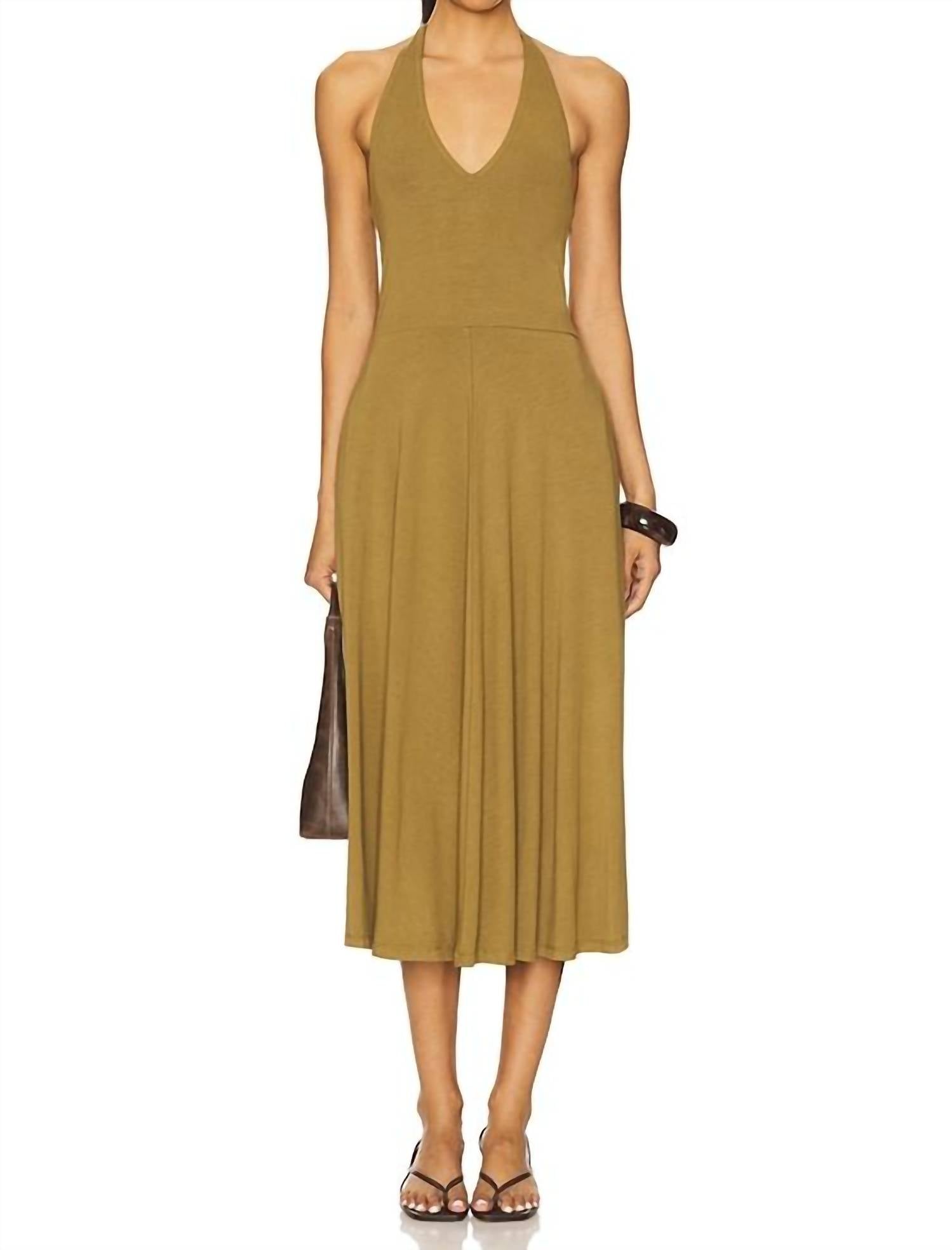 A midi dress so versatile, your options for wearing it are endless. Elevate your vacation wardrobe with the STEVE MADDEN Hazel Halter Neck Sleeveless Midi Dress in Deep Olive. This sleeveless dress offers a chic minimalist style with a halter neckline and practical side pockets. Crafted from a soft blend of rayon and elastane, it measures approximately 45.50" in length and features a comfortable pullover construction with a tie closure. Care for it effortlessly by machine washing and tumble drying, making it a perfect choice for summer adventures.